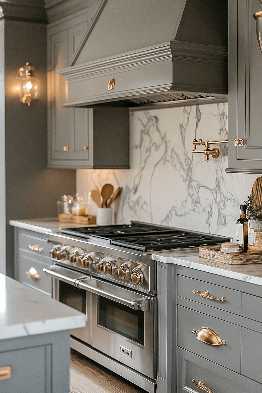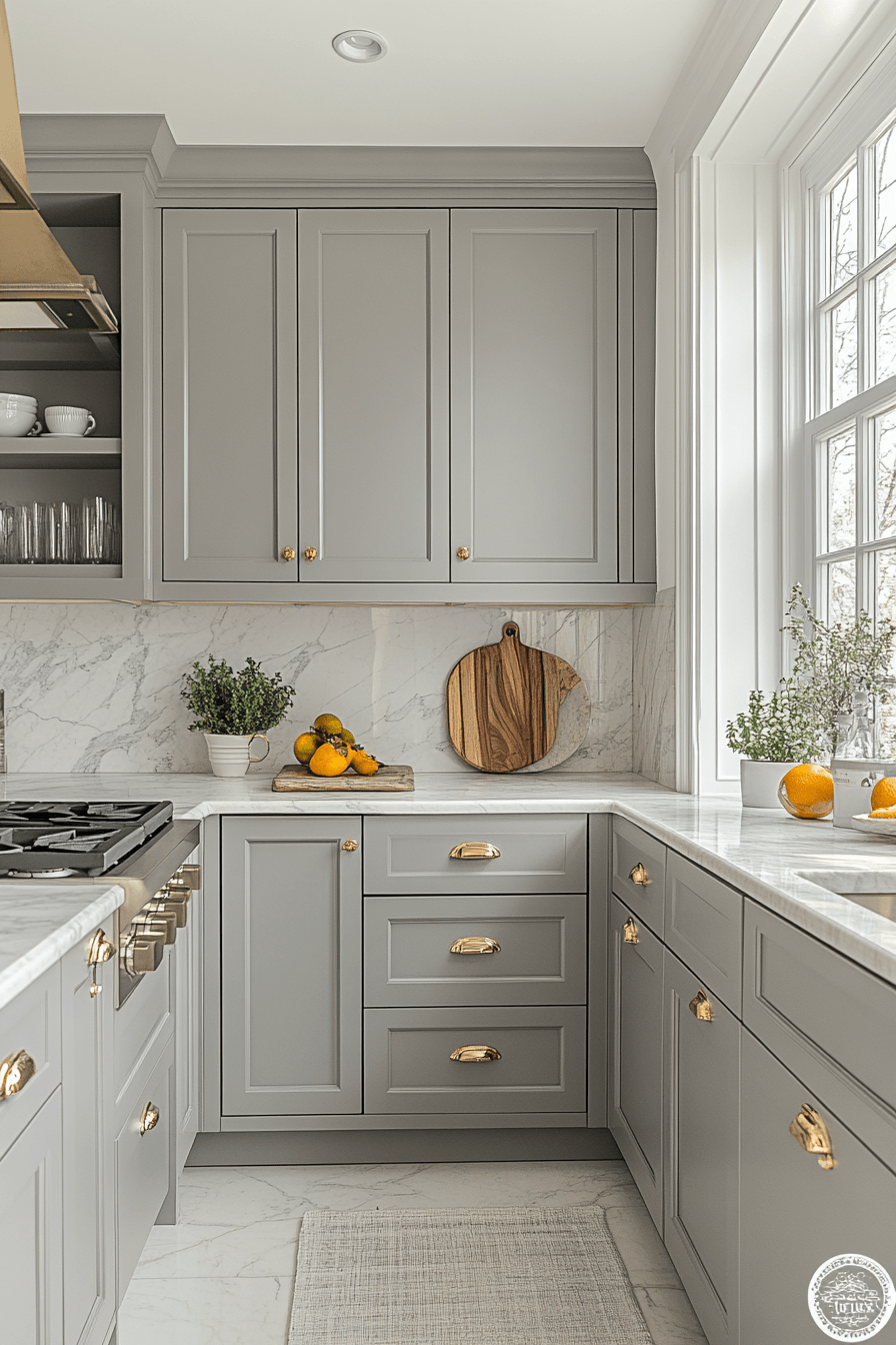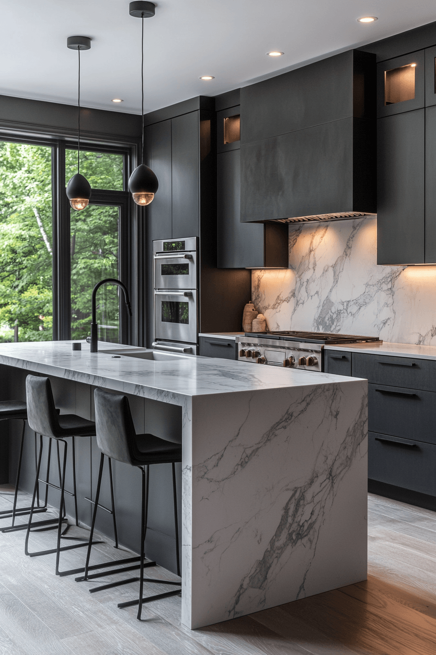 Marble accents elevate a dark grey kitchen with natural elegance and movement. The veining adds artistic detail against deep cabinetry. The contrast feels modern yet timeless. Clean fixtures keep the design balanced. Every surface feels refined and intentional. Introduce marble beauty into your dark grey kitchen today!