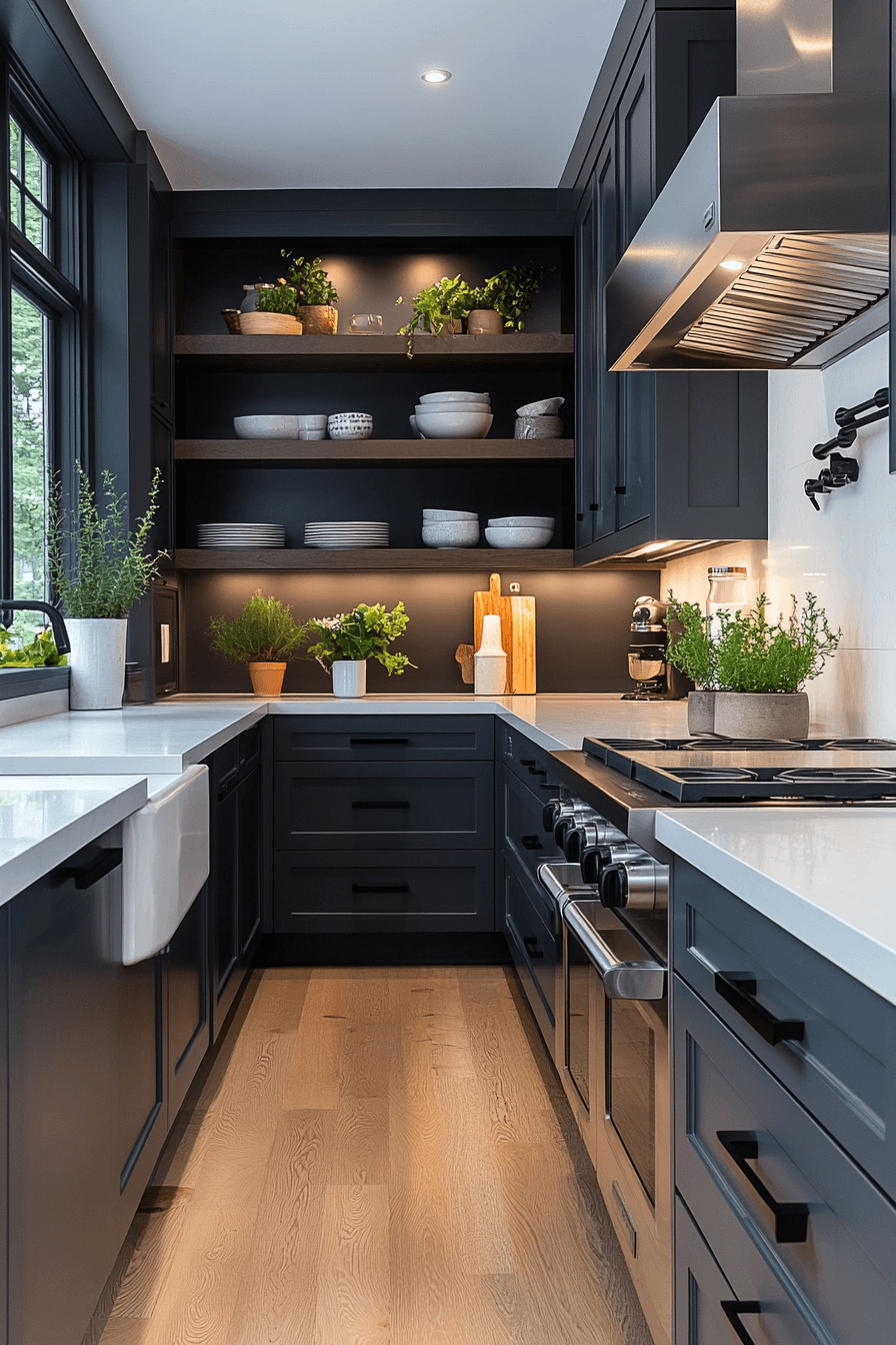 Small layouts thrive in a smartly designed dark grey kitchen that maximizes every inch. Deep cabinetry adds richness without shrinking the space. Efficient storage keeps everything organized. Reflective surfaces enhance light. The design feels open and functional. Optimize your dark grey kitchen with smart layout ideas!