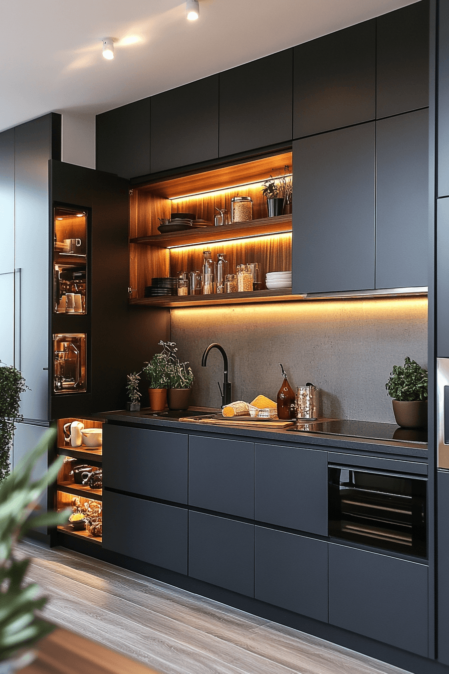 Warm charcoal tones make a dark grey kitchen feel inviting and comfortable without losing its modern edge. Wood countertops and accents add contrast and warmth. Soft lighting enhances the cozy feel. Open shelving introduces personality. The space feels balanced and welcoming. Turn your dark grey kitchen into a warm gathering space now!