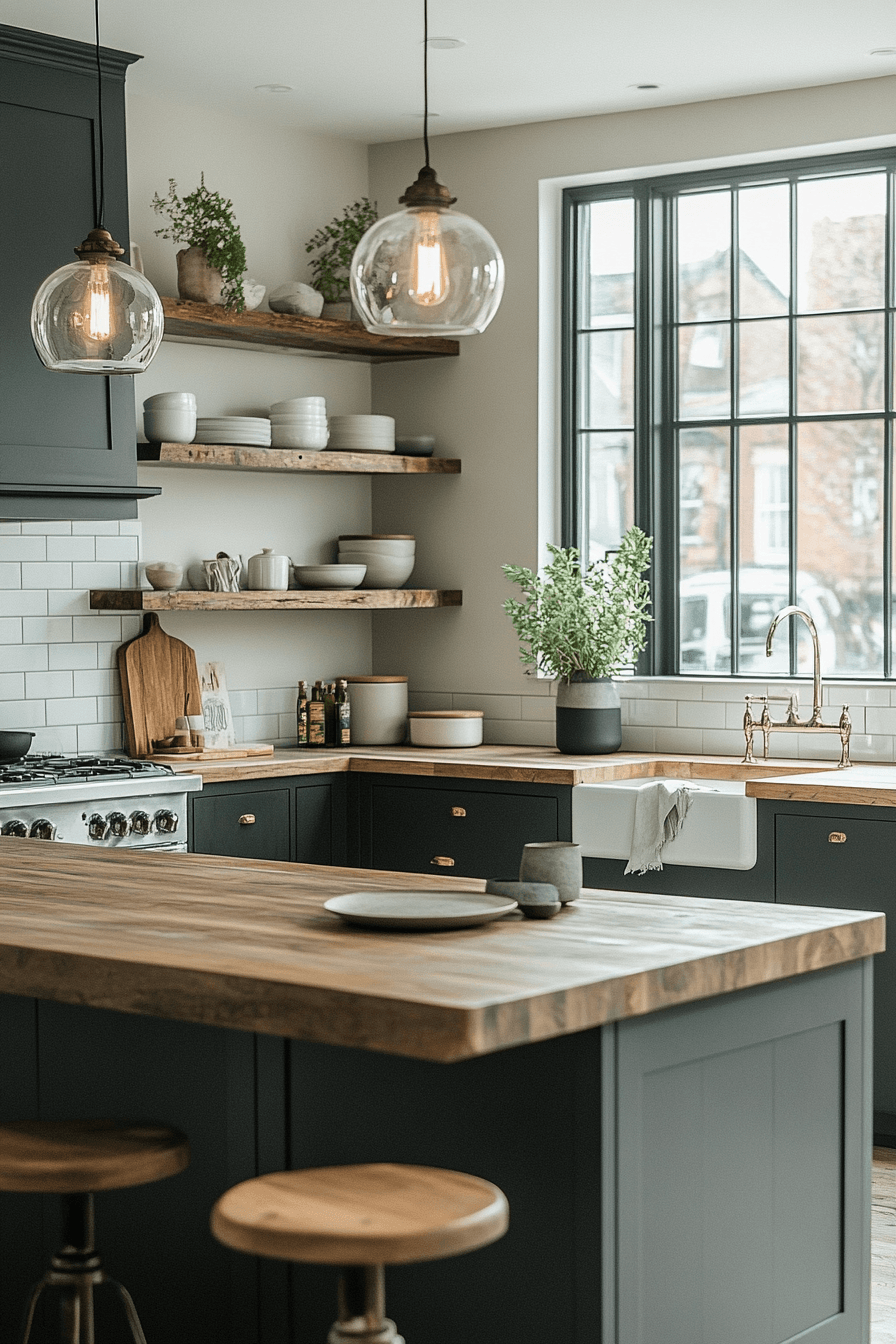 Balanced contrast creates a dark grey kitchen that feels both bold and airy. Light flooring softens the deeper tones. Open shelving adds visual space. Natural light enhances the overall feel. Warm accents bring comfort. The design feels relaxed yet impactful. Create balance in your dark grey kitchen today!