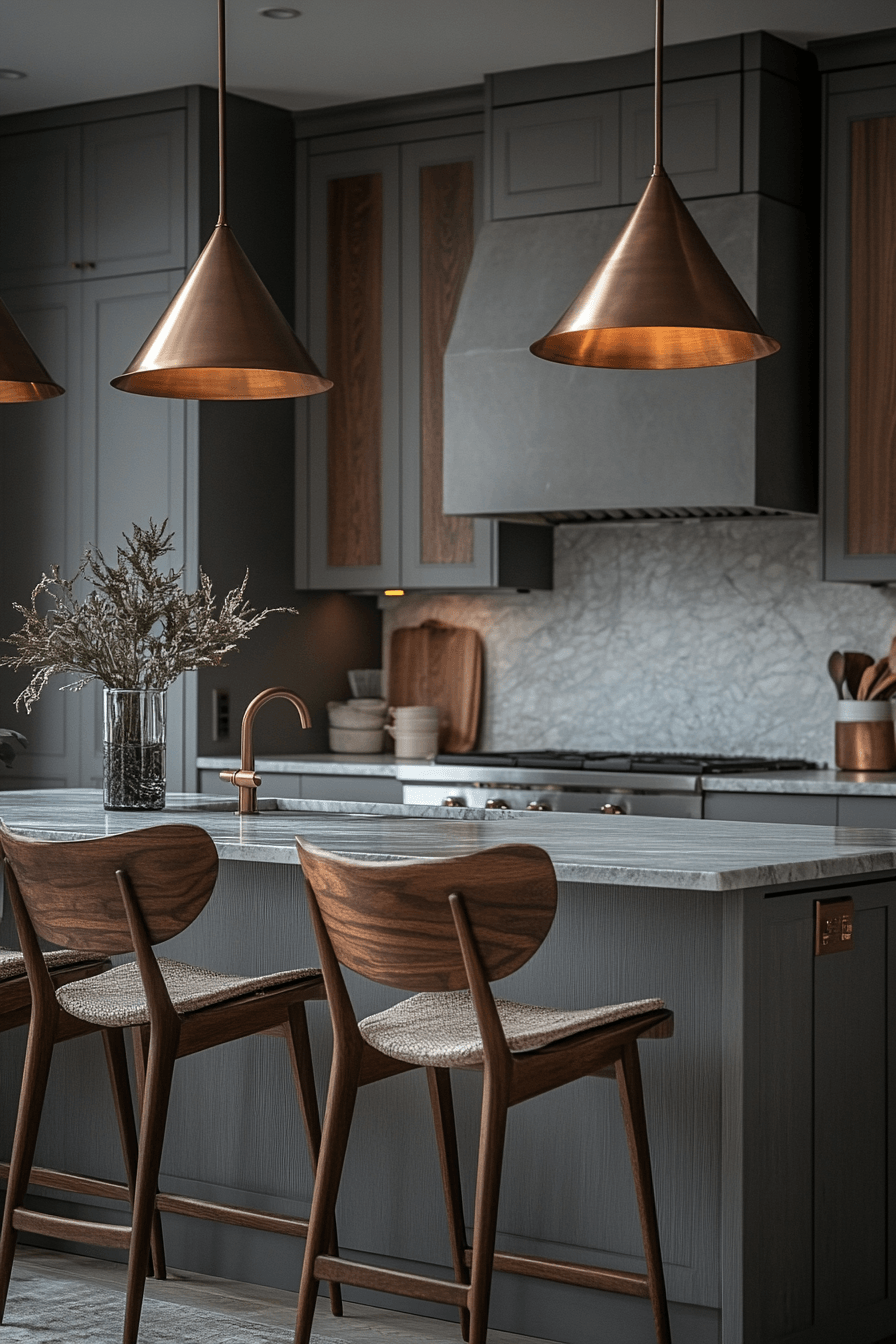 Moody tones feel welcoming in a dark grey kitchen when paired with thoughtful lighting and warm accents. Deep cabinetry and dark surfaces create striking visual contrast. Layered lighting ensures the space stays vibrant rather than heavy. Mixing finishes adds texture and movement throughout. Wood and brass elements soften the palette. Turn your dark grey kitchen into a bold yet inviting space!