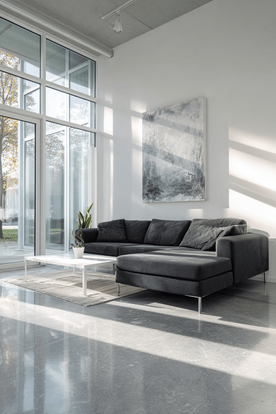 A sleek, pared-down aesthetic brings harmony to a dark grey sofa living room inspired by minimalist design. Light-toned walls brighten the space while allowing the charcoal sofa to stand out as a strong focal point. Simple furnishings and uncluttered surfaces keep everything feeling calm and intentional. Subtle metallic or black accents introduce a refined edge without adding visual noise. This dark grey sofa living room feels balanced, modern, and effortlessly serene. Discover how simplicity can completely transform your space!