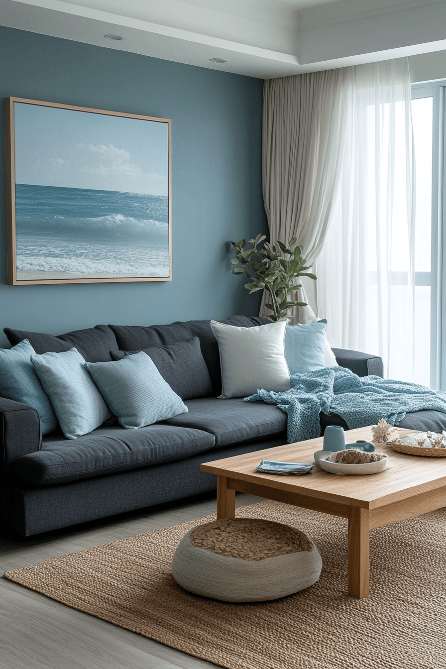 A breezy coastal palette refreshes a dark grey sofa living room with light and airy charm. Soft blues, sandy neutrals, and crisp whites create a calming backdrop. The charcoal sofa adds contrast while maintaining elegance. Natural textures like linen and woven elements enhance the relaxed vibe. This dark grey sofa living room feels fresh and serene. Bring coastal calm into your home today!