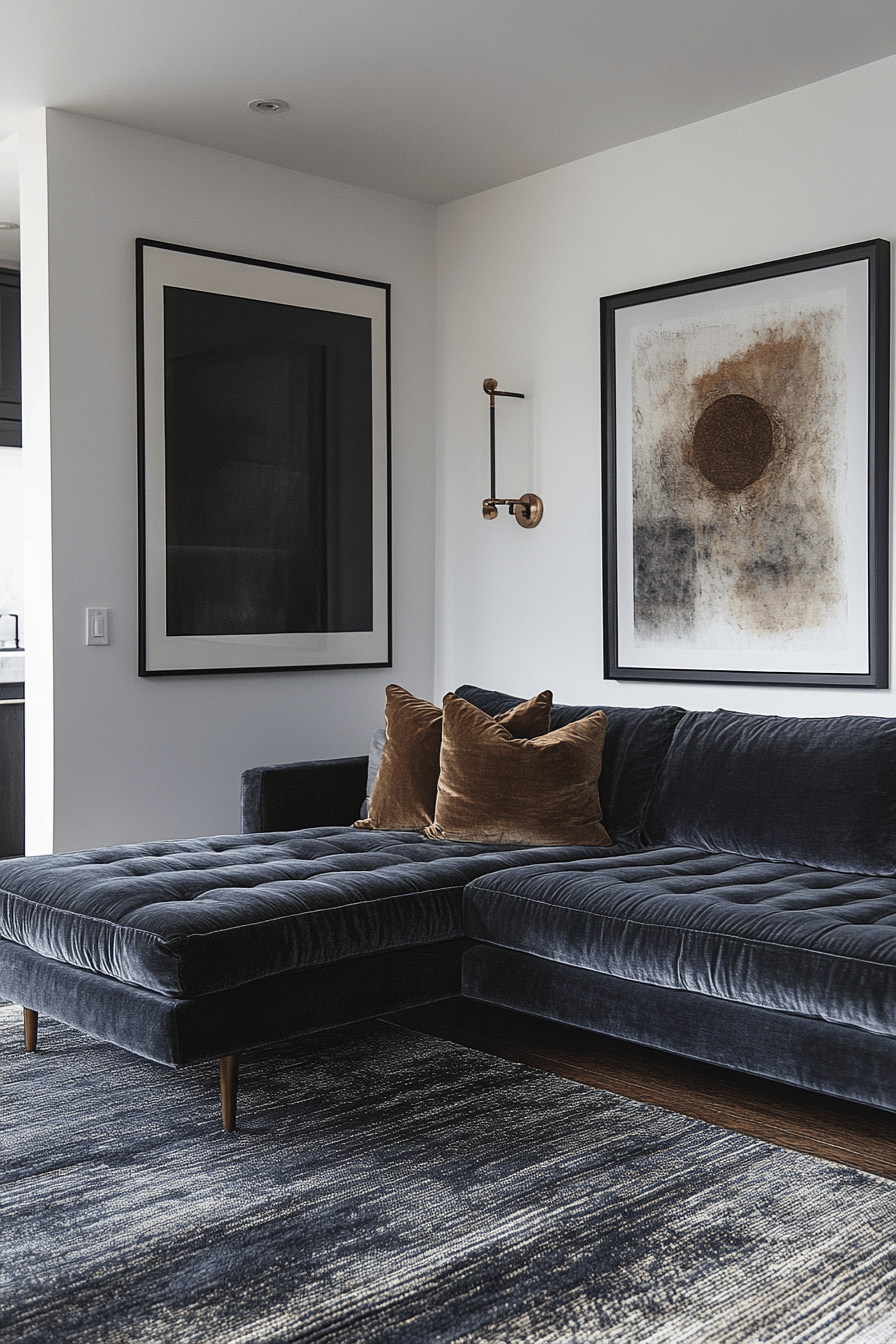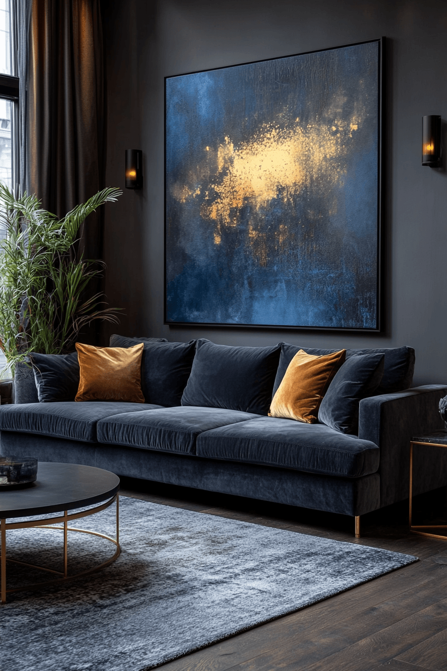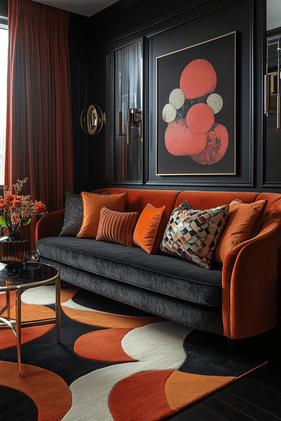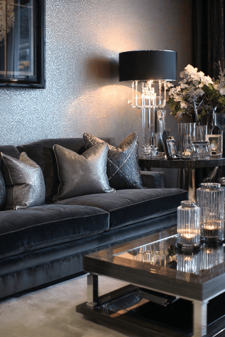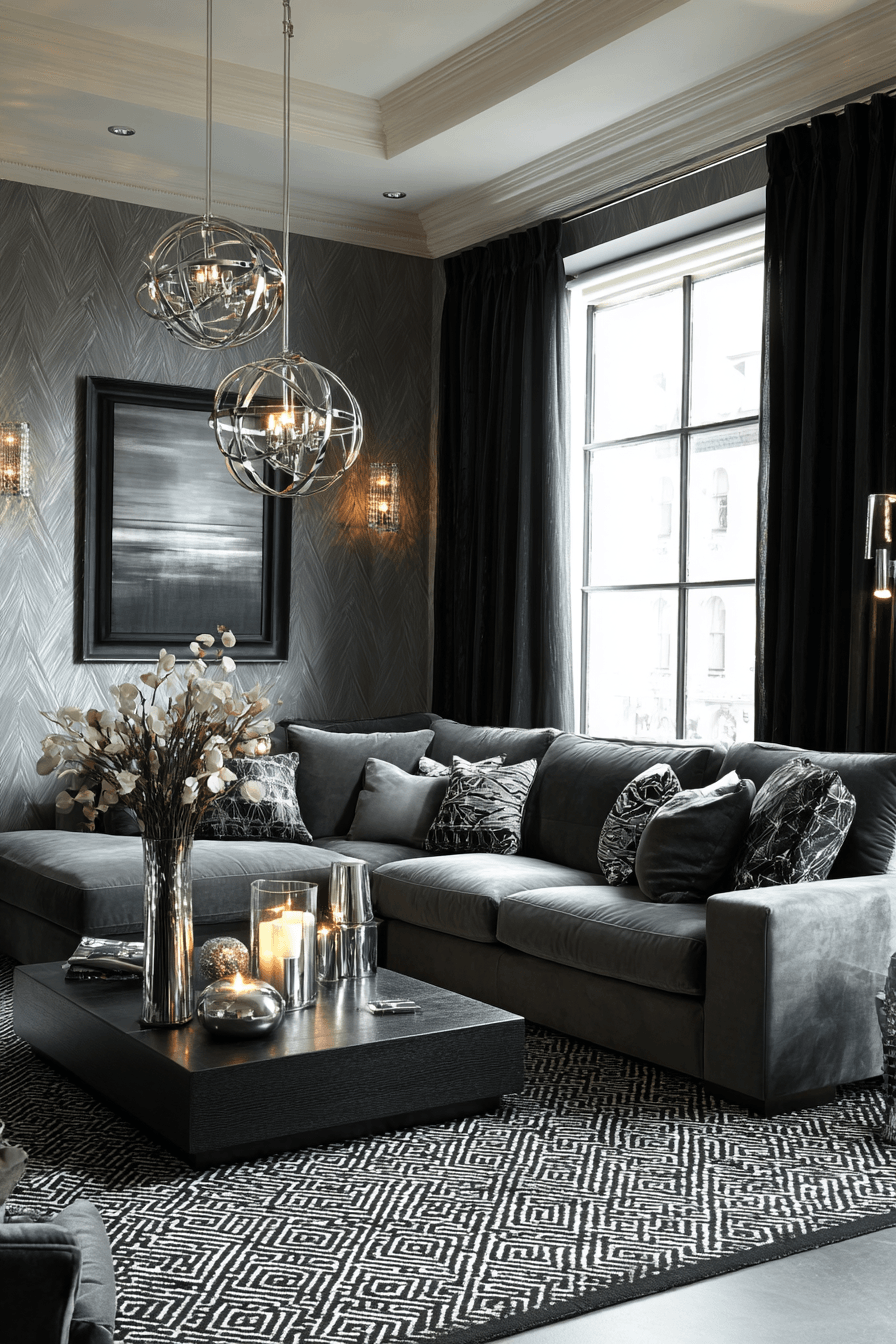 Art Deco influence brings bold glamour into a dark grey sofa living room filled with statement details. The charcoal sofa becomes the centerpiece among geometric patterns and gold accents. Luxurious materials and mirrored finishes enhance the richness. Sleek silhouettes add a timeless touch. This dark grey sofa living room feels dramatic and refined. Discover the beauty of Art Deco styling now!