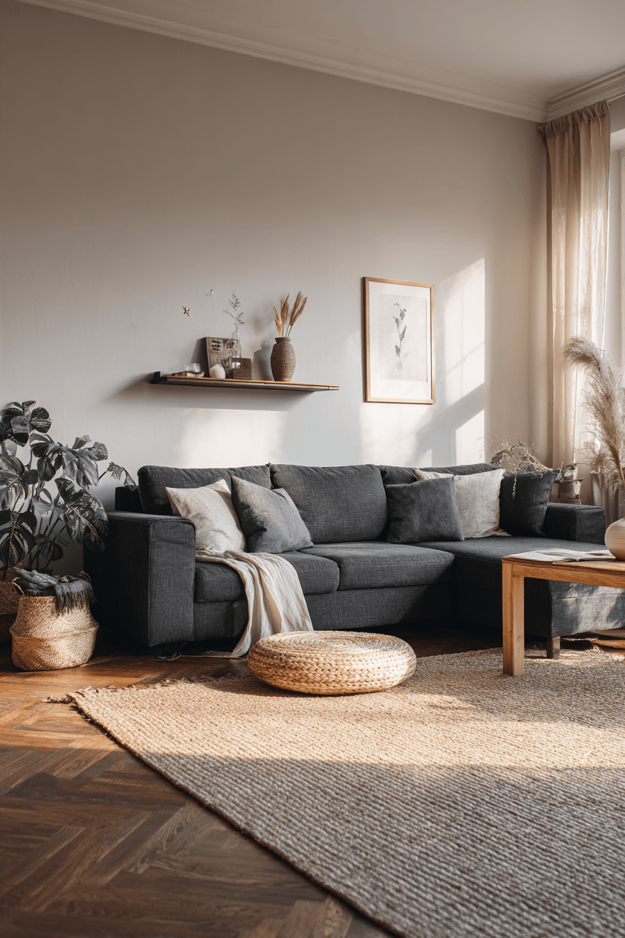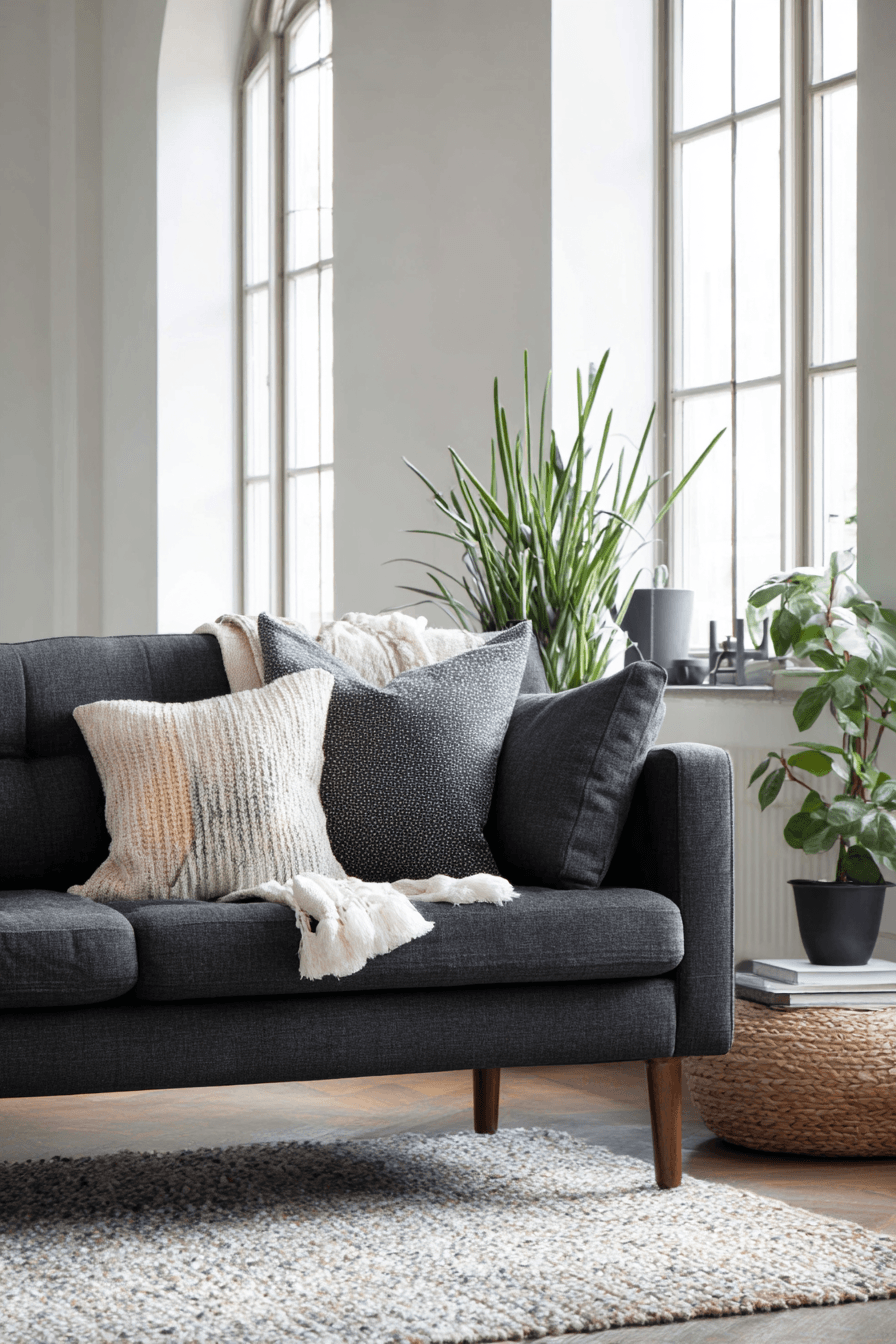 Scandinavian simplicity brings warmth and clarity into a dark grey sofa living room designed for comfort. Light wood tones and soft neutrals brighten the space while enhancing the charcoal sofa. Cozy textiles introduce softness and texture. Functional design keeps everything practical and inviting. This dark grey sofa living room feels airy, relaxed, and beautifully balanced. Get inspired by more cozy Scandinavian interiors now!