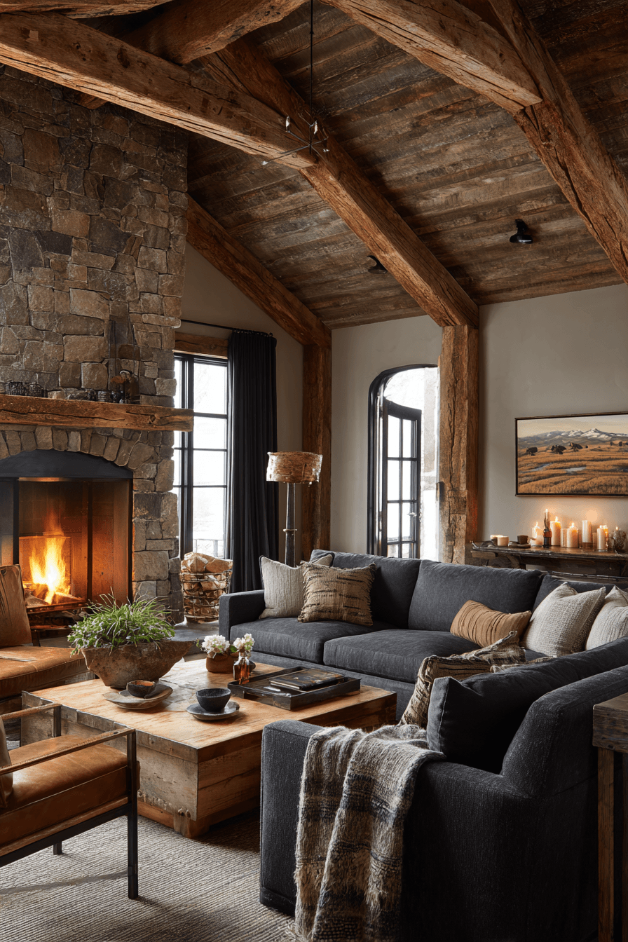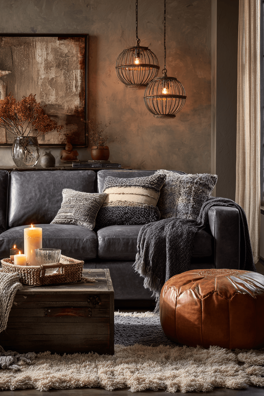Rustic charm brings warmth into a dark grey sofa living room filled with natural textures. Wood finishes and earthy tones soften the bold sofa color. Cozy fabrics enhance comfort and relaxation. Soft lighting adds a welcoming glow. This dark grey sofa living room feels inviting and lived-in. Embrace rustic warmth in your home now!