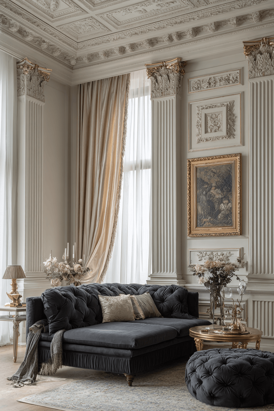 Neo-classical elements add timeless elegance to a dark grey sofa living room with refined beauty. Architectural details create a sophisticated backdrop. The charcoal sofa pairs beautifully with classic furnishings. Subtle patterns and gold accents enhance the look. This dark grey sofa living room feels graceful and polished. Discover timeless design inspiration today!