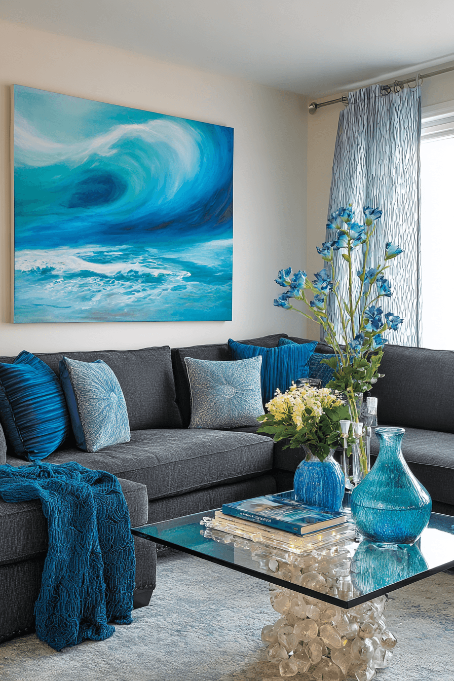 Ocean-inspired tones create a refreshing dark grey sofa living room with a calming vibe. Blues and greens complement the charcoal sofa beautifully. Light textures and simple décor keep the space open. Natural accents enhance the coastal feel. This dark grey sofa living room feels peaceful and rejuvenating. Refresh your space with ocean-inspired style today!