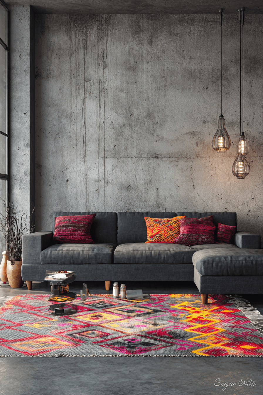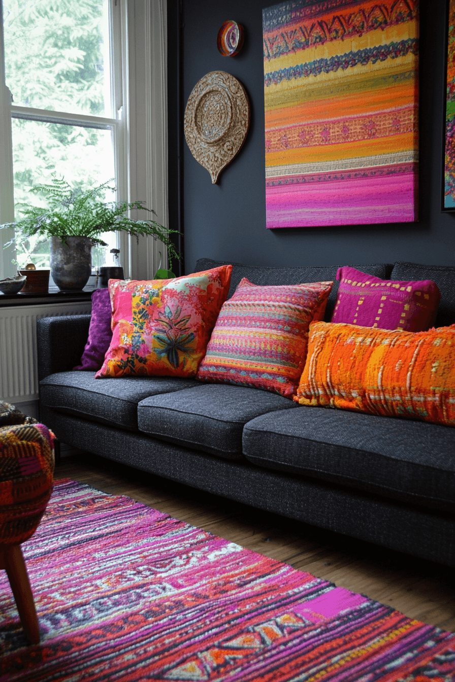 Bold colors and graphic patterns energize a dark grey sofa living room with playful personality. The charcoal sofa acts as a neutral anchor for vibrant décor choices. Statement pieces and geometric designs add excitement and movement. The contrast between dark and bright tones keeps the space dynamic. This dark grey sofa living room feels lively and stylish. Dive into more bold design inspiration now!