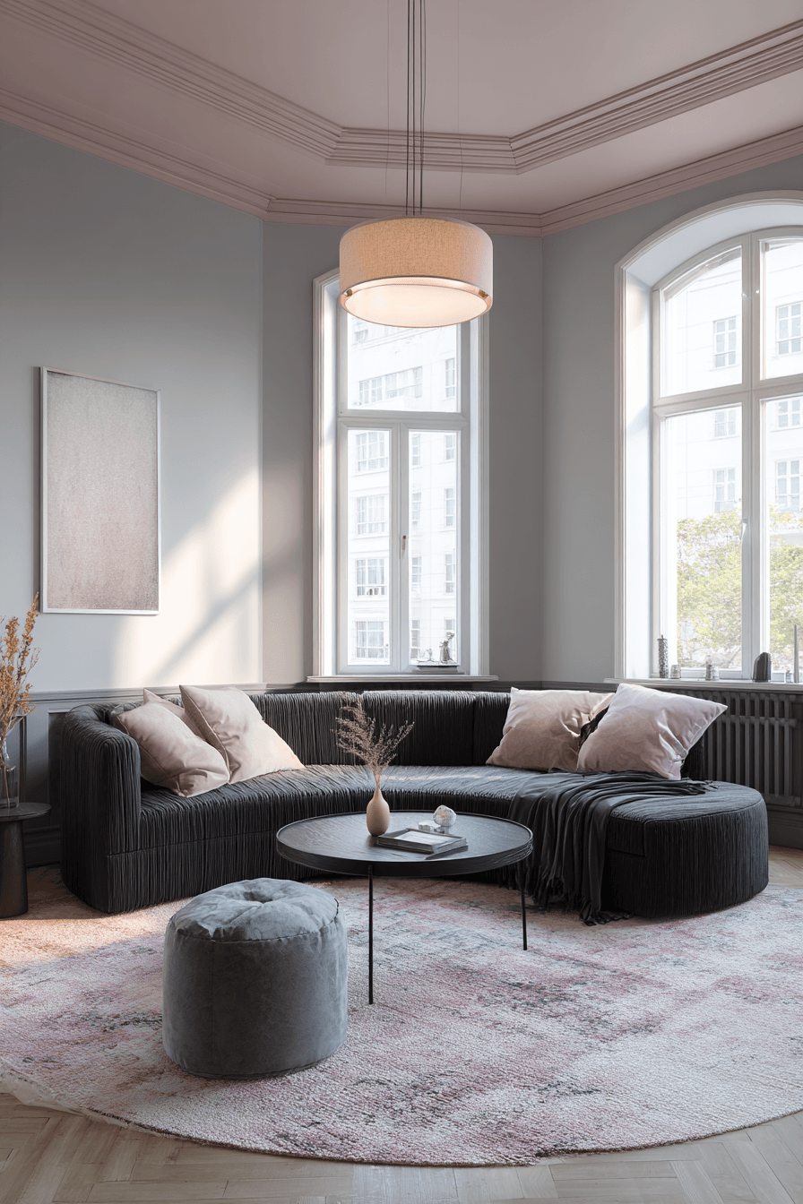Soft modern elements bring comfort into a dark grey sofa living room with contemporary charm. Rounded forms and gentle textures balance the bold sofa. Neutral tones create a warm atmosphere. Cozy materials enhance livability. This dark grey sofa living room feels stylish and inviting. Discover soft modern design inspiration now!