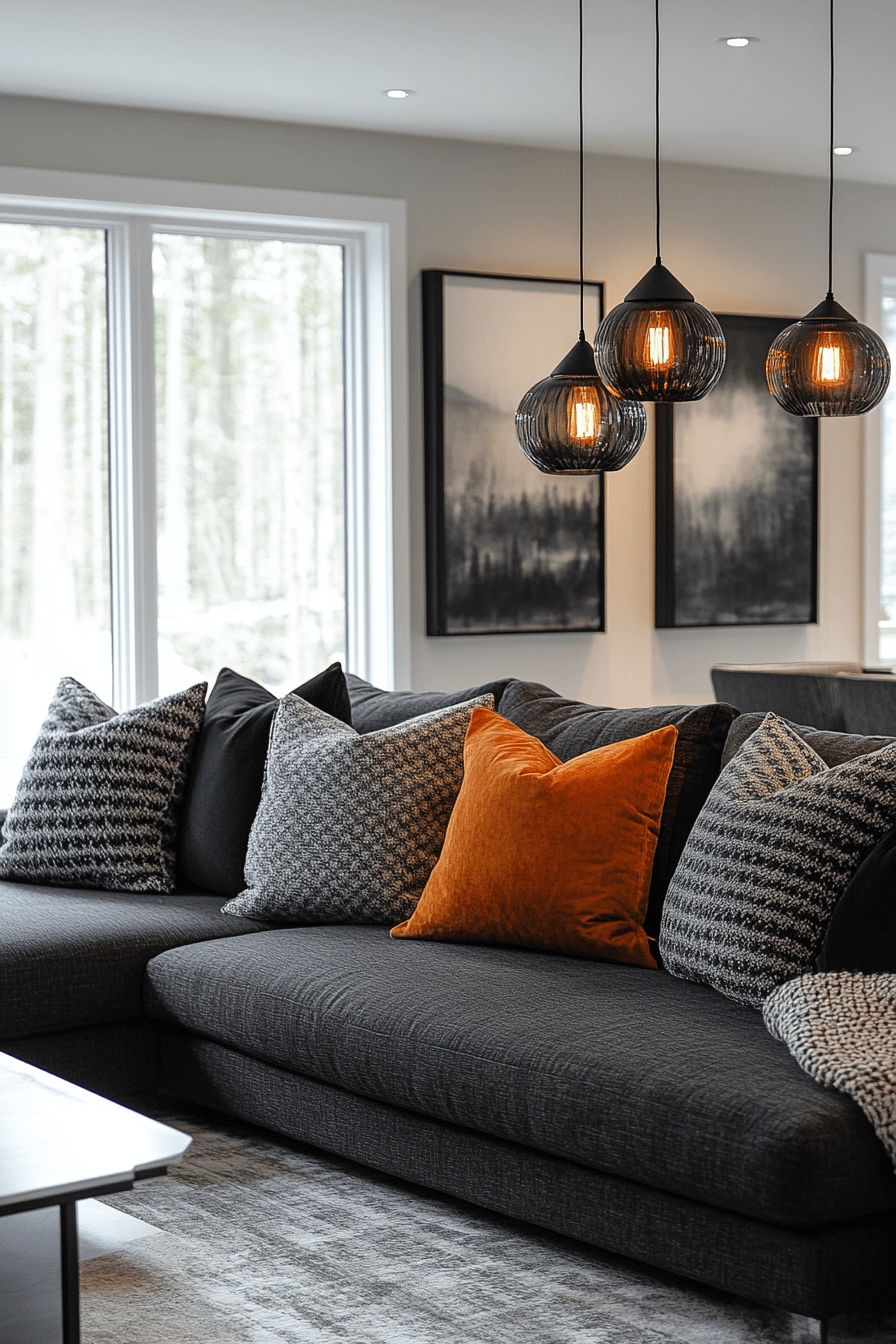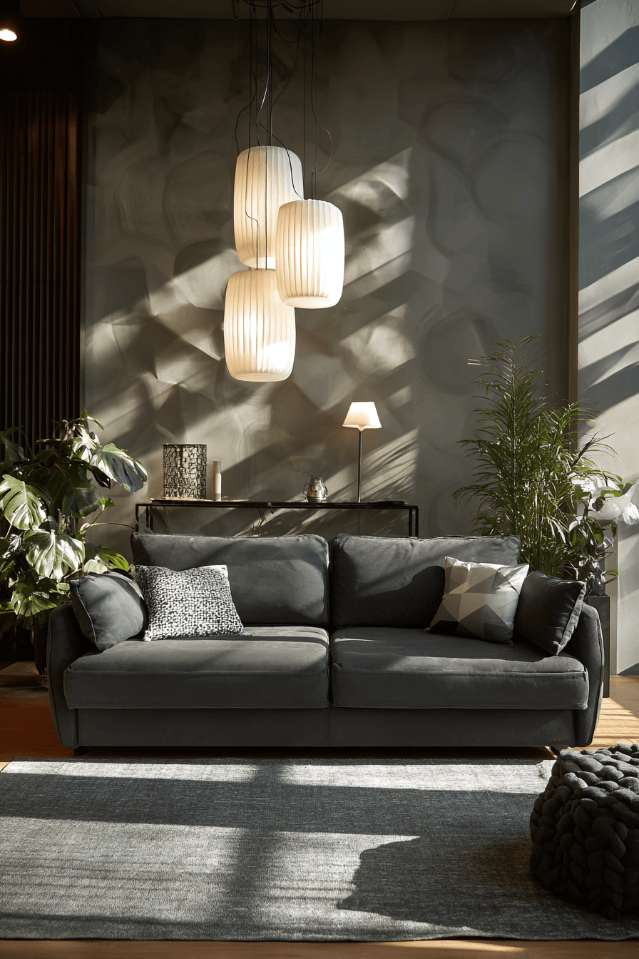 Lighting design transforms a dark grey sofa living room into a visually dynamic space. The charcoal sofa becomes the focal point under layered lighting. Shadows and highlights add depth and movement. Architectural features are enhanced by light. This dark grey sofa living room feels artistic and immersive. Illuminate your space with creative lighting ideas!