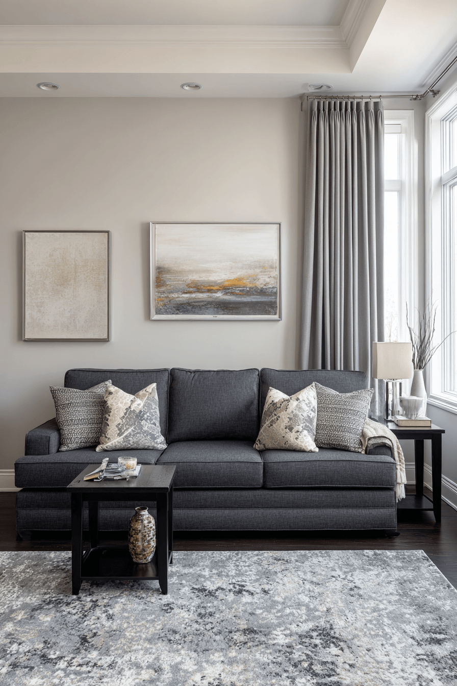 A refined blend of comfort and elegance shapes a dark grey sofa living room with contemporary appeal. The deep grey sofa contrasts softly against light rugs and airy drapery. Sleek furniture keeps the layout open while highlighting the sofa as the centerpiece. Carefully chosen accents add a polished, sophisticated finish. This dark grey sofa living room feels luxurious yet welcoming. Unlock more elevated living room inspiration today!
