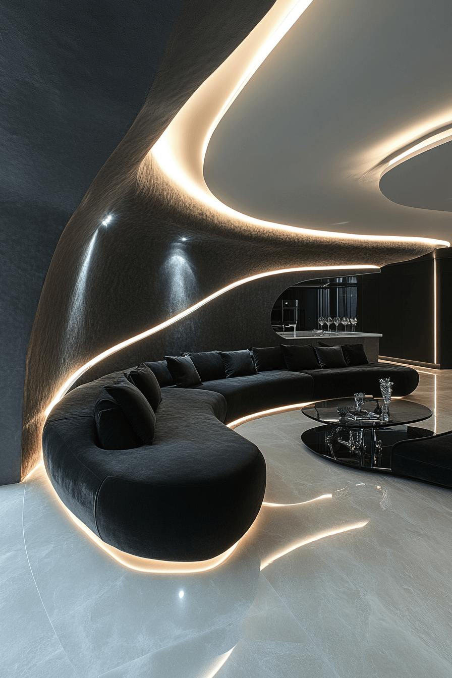 A futuristic concept reimagines a dark grey sofa living room with sleek, forward-thinking design. Smooth finishes, reflective materials, and innovative lighting set the tone. The charcoal sofa provides a grounding element within the modern palette. Bright accents and clean surfaces enhance contrast. This dark grey sofa living room feels cutting-edge and visually exciting. Step into futuristic design inspiration now!