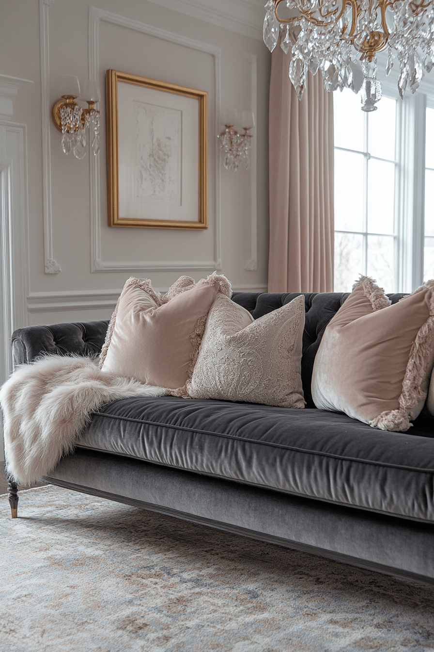 Soft glamour transforms a dark grey sofa living room into an elegant and inviting retreat. Gentle hues and delicate textures surround the charcoal sofa. Velvet and silky fabrics introduce comfort and sophistication. Reflective accents enhance the overall glow of the space. This dark grey sofa living room feels graceful and effortlessly chic. Find more soft glam styling ideas today!