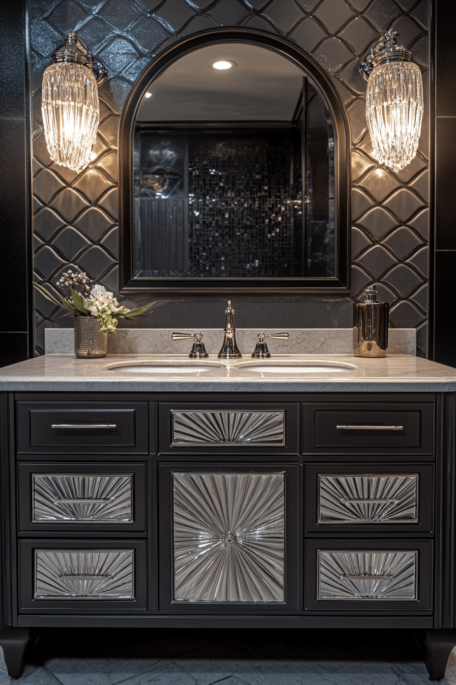 Art Deco design turns a double sink bathroom vanity into a bold centerpiece with geometric details and luxurious finishes. Rich materials and metallic accents elevate the look. A double sink bathroom vanity in this style feels glamorous and striking. The space becomes visually captivating. It’s perfect for statement interiors. Add dramatic elegance to your bathroom now!