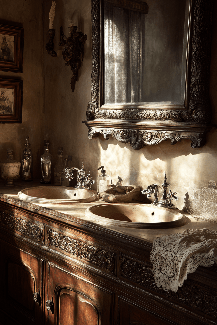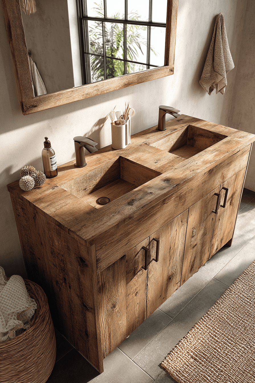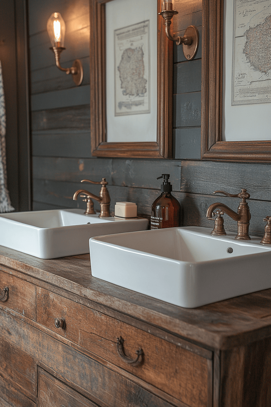 Repurposed furniture creates a unique double sink bathroom vanity that adds personality and history to the space. Aged materials bring warmth and character. A double sink bathroom vanity in this style feels one-of-a-kind. It blends vintage charm with modern function. The result feels creative and personal. Add unique style to your bathroom today!