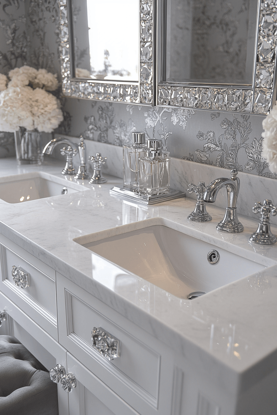 Mirrored finishes create a luminous effect with a double sink bathroom vanity that enhances light and space. Reflective surfaces brighten the entire room. A double sink bathroom vanity in this style feels glamorous and open. It works especially well in smaller bathrooms. The design feels elegant and eye-catching. Add sparkle to your bathroom with a mirrored double sink bathroom vanity today!
