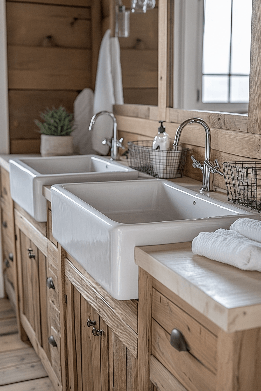 Organic textures shine through a rustic double sink bathroom vanity that brings warmth and authenticity into the space. Natural wood grains add depth and personality to the design. A double sink bathroom vanity in this style pairs beautifully with warm lighting and earthy accents. The overall look feels cozy yet timeless. It’s a perfect blend of comfort and durability. Add natural charm to your bathroom with a rustic double sink bathroom vanity now!