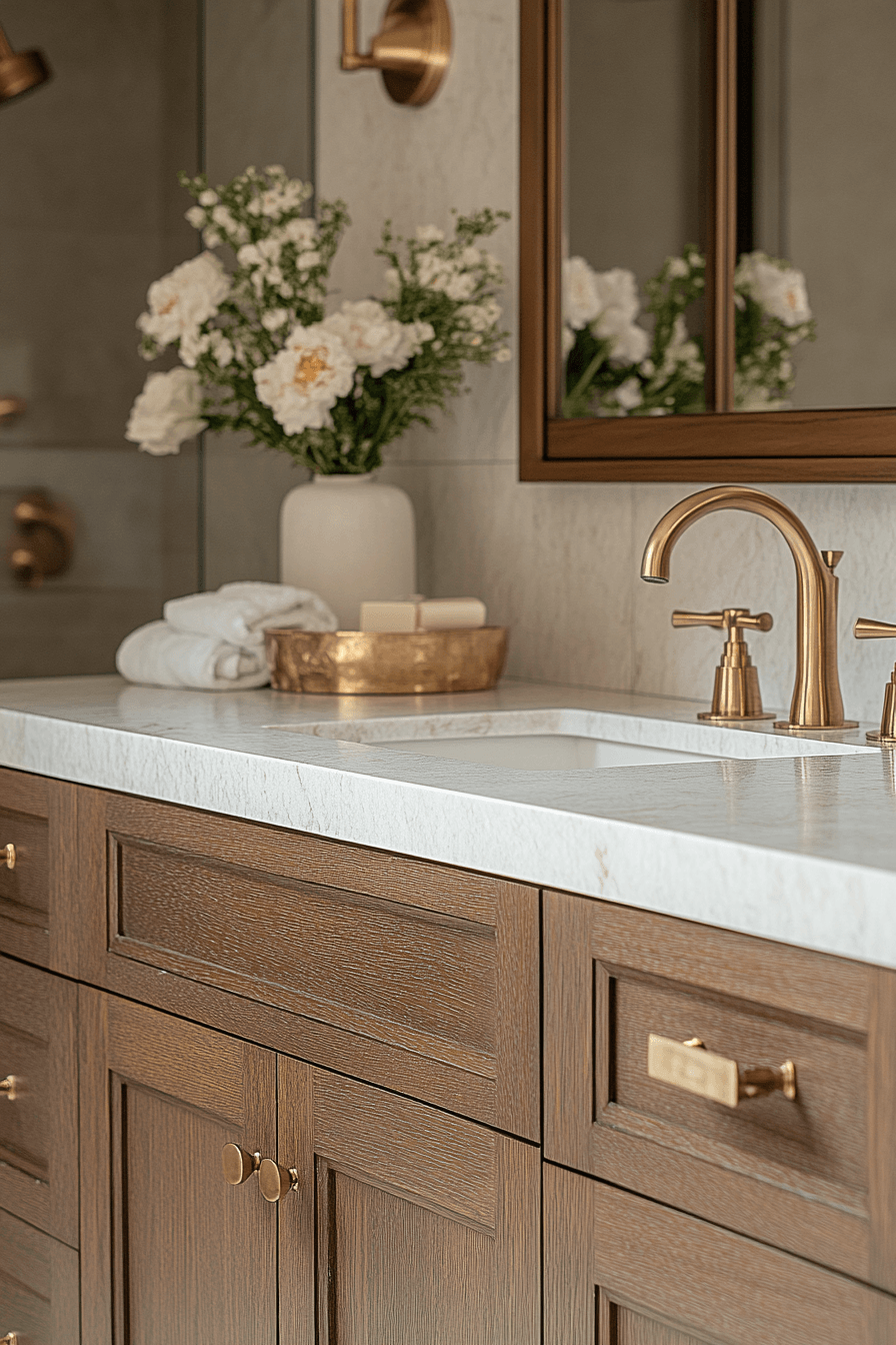 Mixed materials create depth and personality in a double sink bathroom vanity that blends textures beautifully. Combining wood, stone, and metal adds visual interest. A double sink bathroom vanity in this style feels curated and dynamic. The design stands out as a centerpiece. The space feels modern and expressive. Refresh your bathroom with a mixed-material double sink bathroom vanity now!