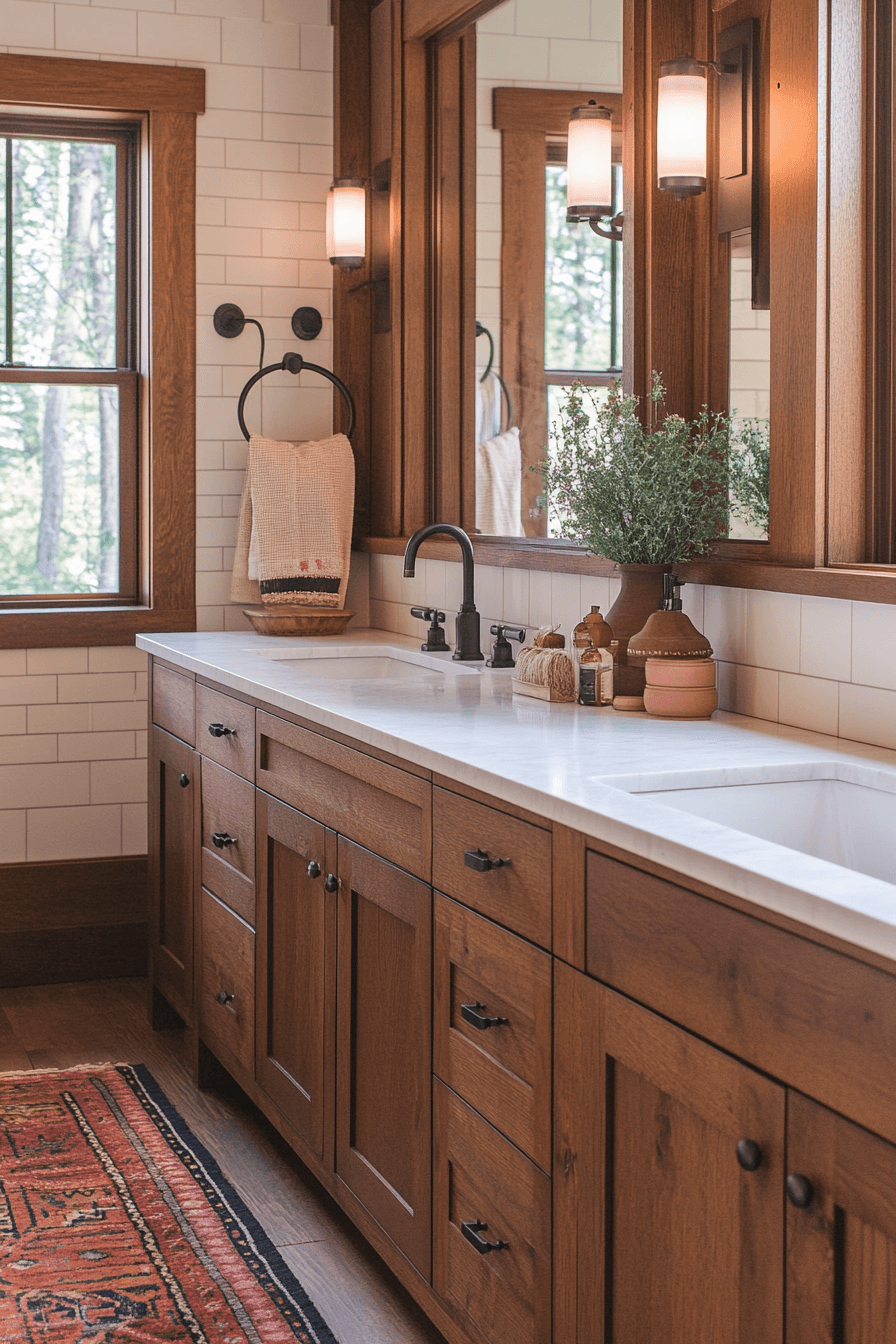 Craftsman details bring warmth and durability to a double sink bathroom vanity built with precision and care. Rich wood tones enhance the design. A double sink bathroom vanity in this style feels timeless and sturdy. The craftsmanship stands out beautifully. The space feels grounded and inviting. Add handcrafted charm to your bathroom now!