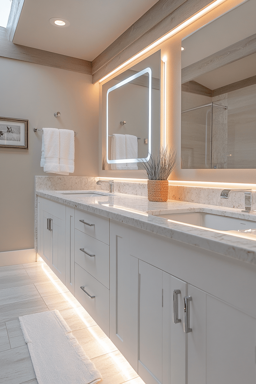 Smart features upgrade a double sink bathroom vanity with modern technology that enhances everyday convenience. Integrated lighting and touchless fixtures improve functionality. A double sink bathroom vanity in this style feels advanced and efficient. The design remains sleek and clean. The space feels future-ready. Upgrade your bathroom with smart design today!