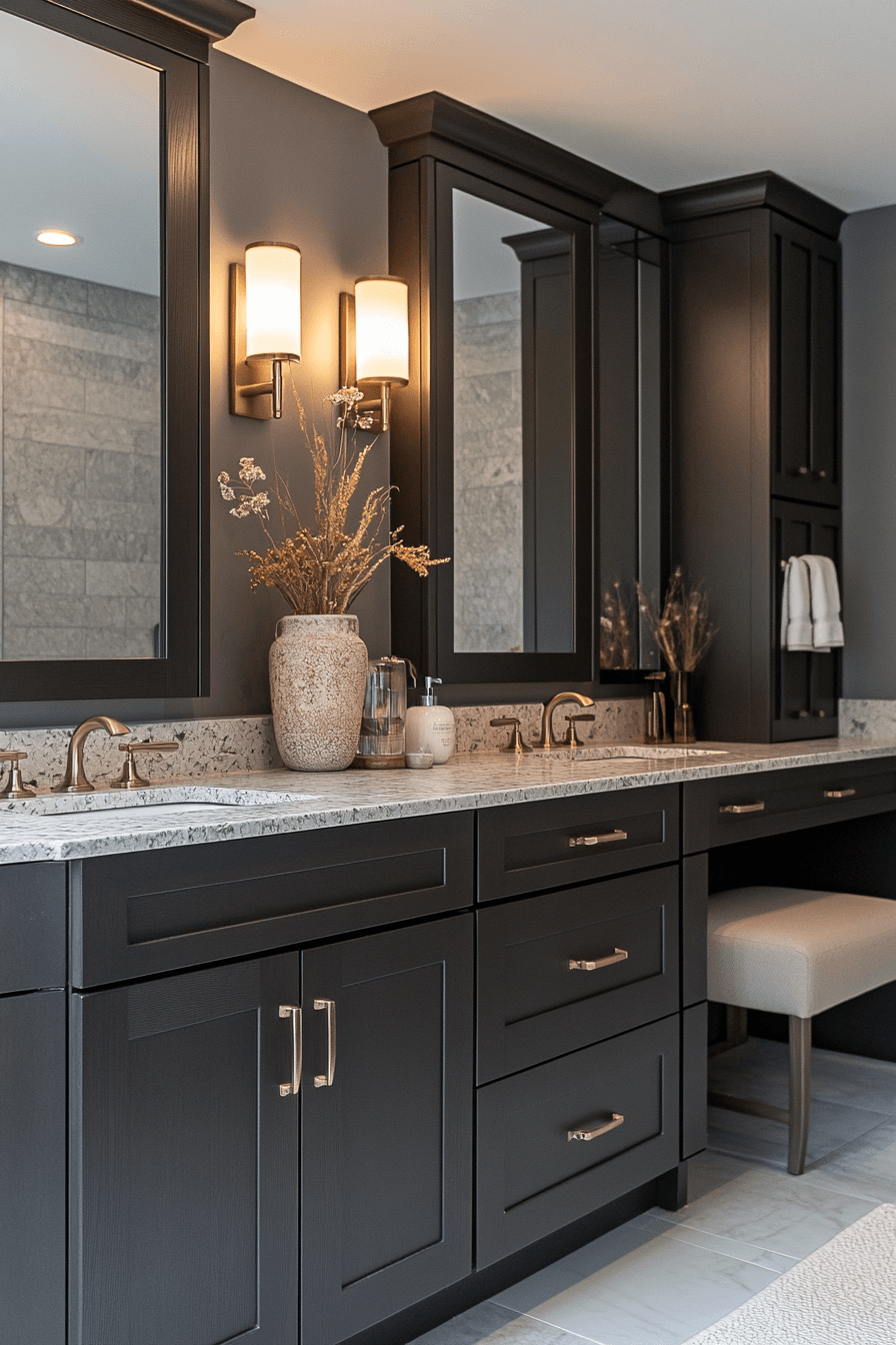 A bold black finish gives a double sink bathroom vanity a dramatic and sophisticated edge that stands out beautifully. The deep color anchors the entire design. A double sink bathroom vanity in black creates striking contrast with lighter elements. Sleek hardware enhances the modern feel. The result feels polished and high-end. Make a bold statement with a black double sink bathroom vanity today!