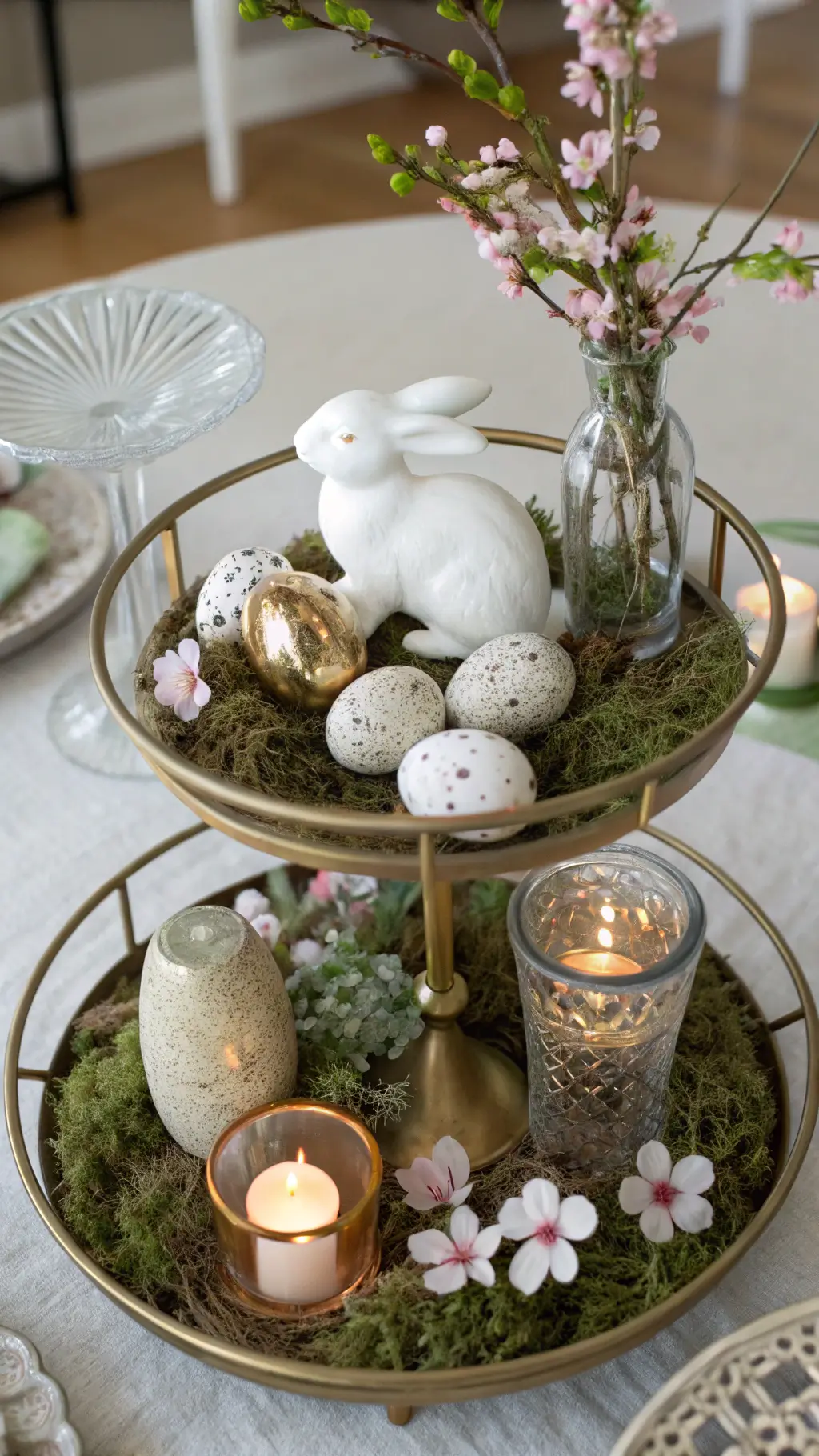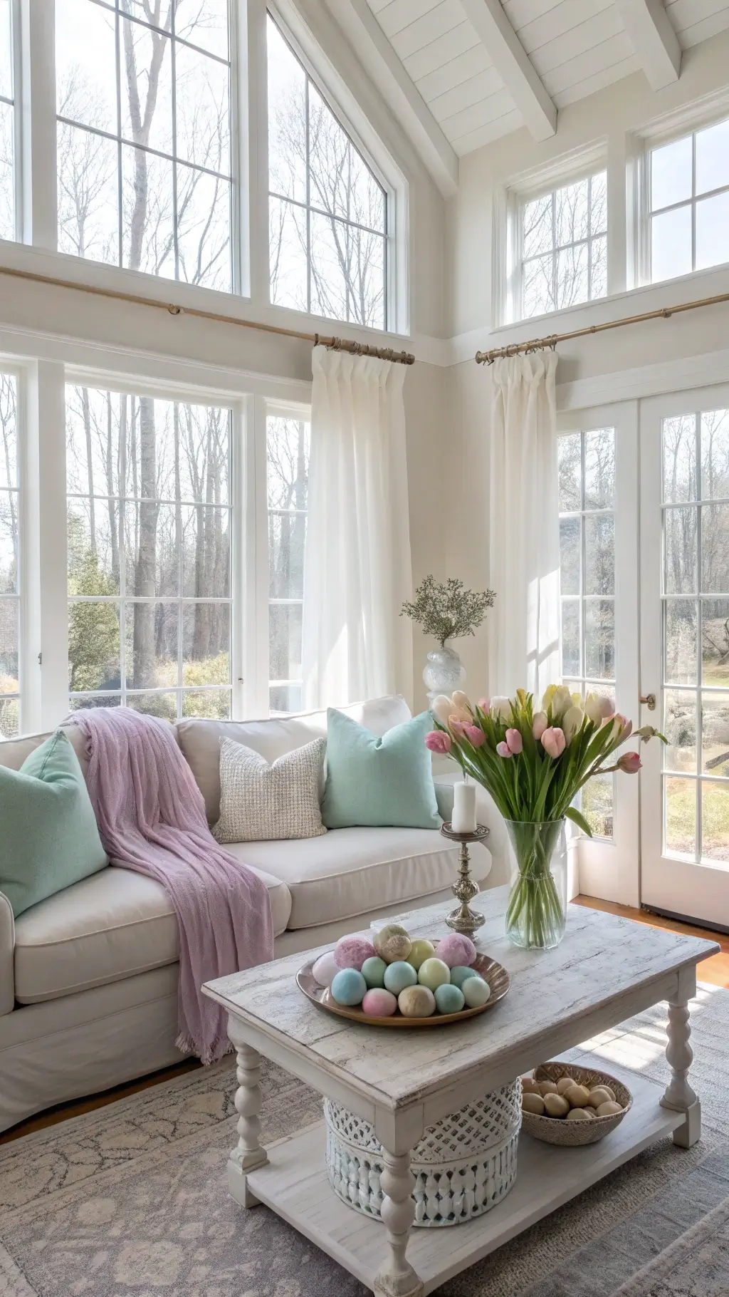 "Easter-themed living room with pastel decorations, white bunny centerpiece, speckled eggs, fresh flowers, and metallic accents in soft morning light"
