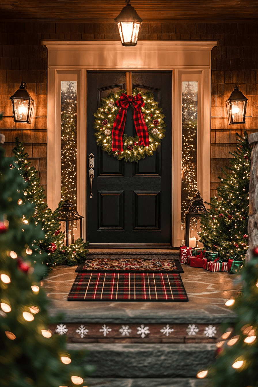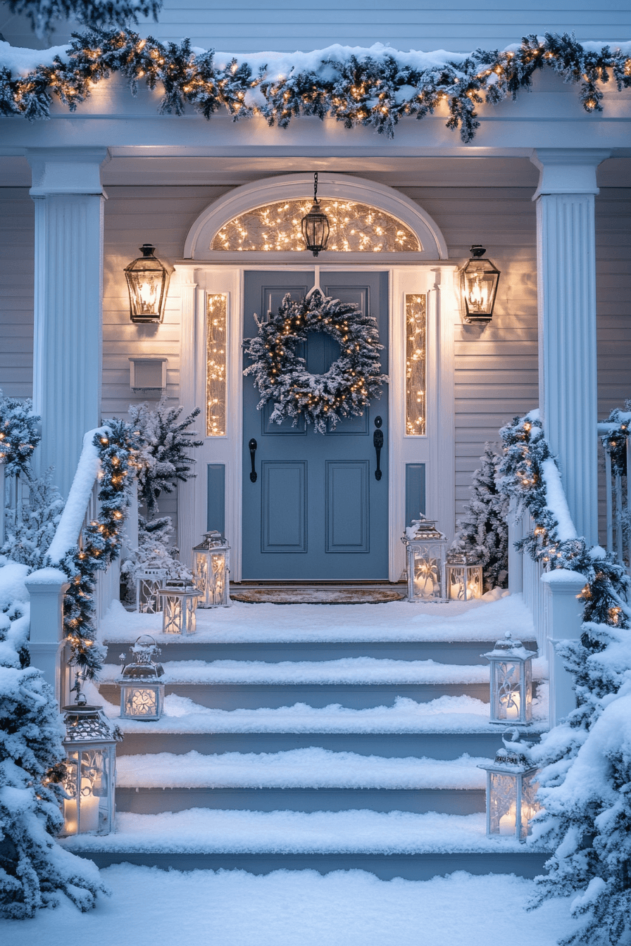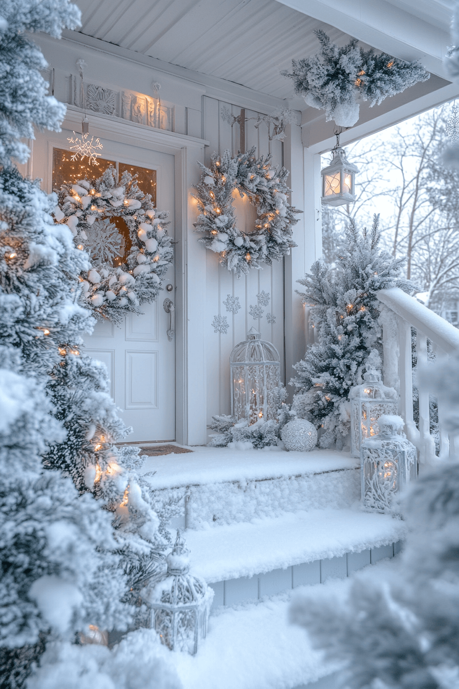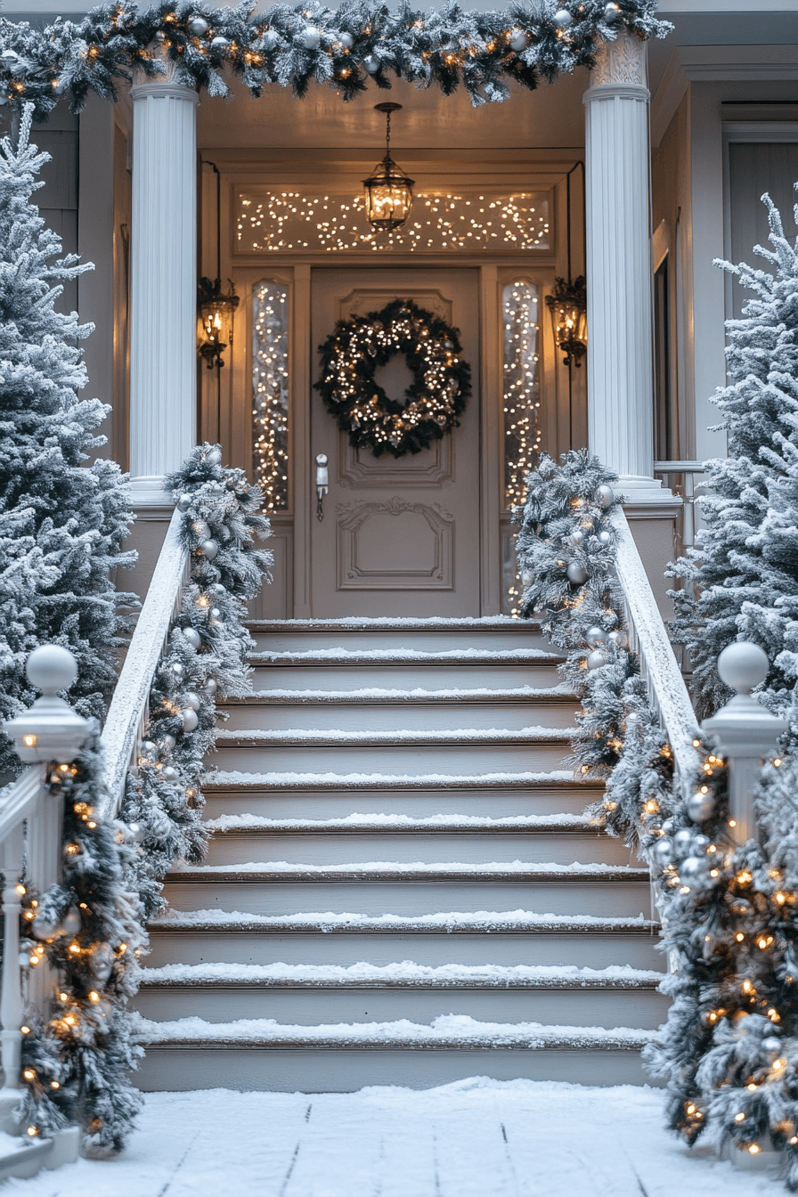Transform your entryway into a glowing snow-kissed dream with front porch Christmas decor that sparkles from step to ceiling. Frosted garlands, shimmering bows, and cool white lights create a landscape of winter wonder. Subtle silver accents dance under the glow, while a soft doormat grounds the scene in warmth. The result is sophisticated yet cozy—a picture-perfect welcome for every guest.