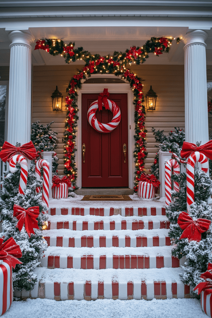 Add playful sweetness with front porch Christmas decor inspired by candy canes. Stripe ribbons, peppermint pillows, and red-white twinkle lights bring cheerful whimsy. Oversized candy props make your porch a crowd-pleaser for all ages. The effect is joyful and bright.