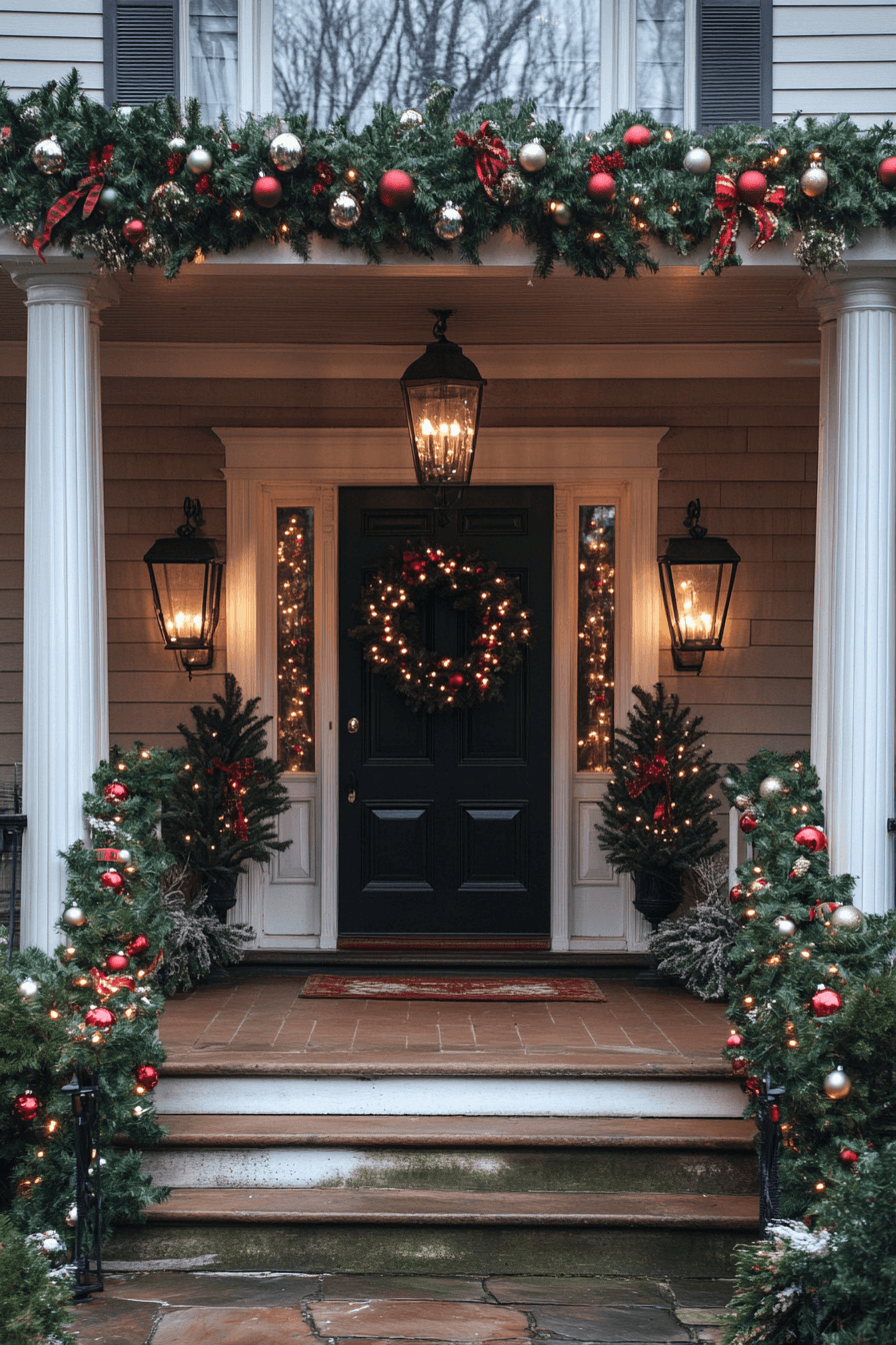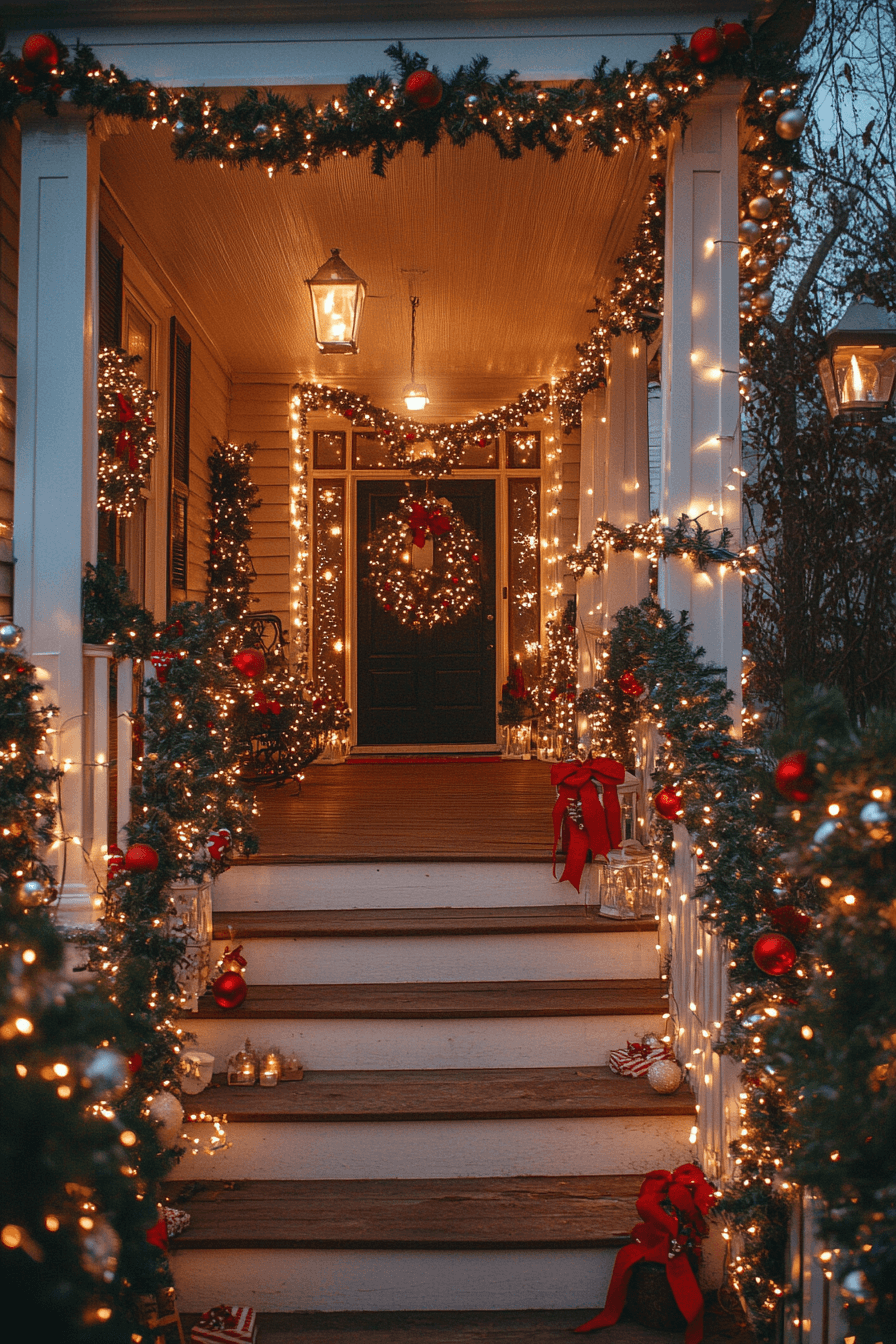 Frame your doorway with garlands that glimmer under the night sky. This lush front porch Christmas decor layers greenery, ornaments, and bows for irresistible dimension. Warm fairy lights weave through every strand for depth and radiance. The overall effect is classic yet modern.
