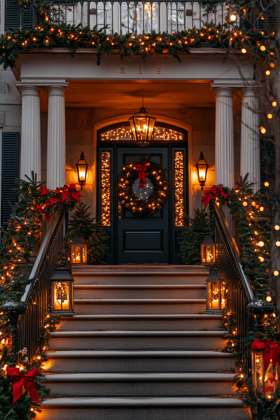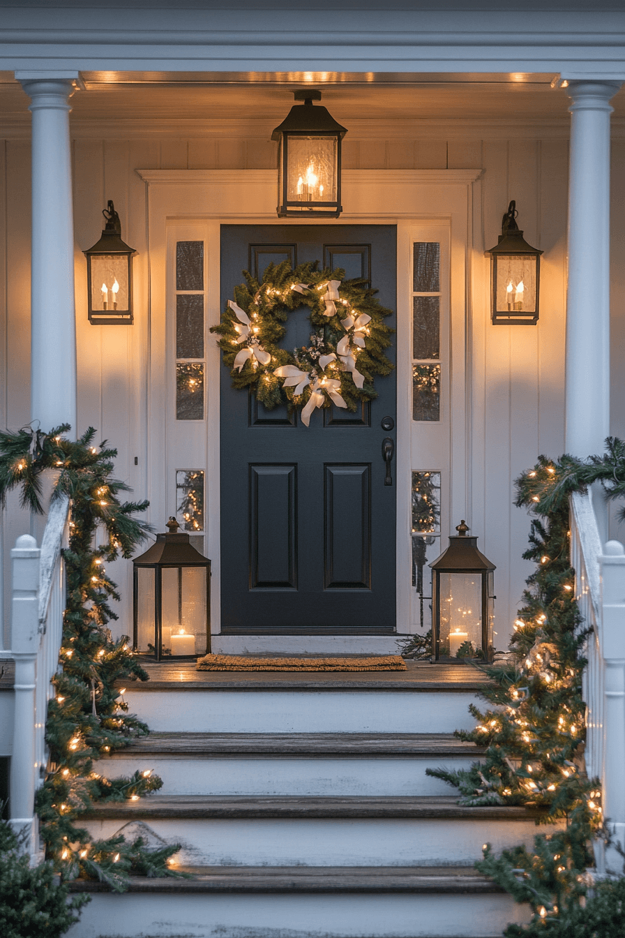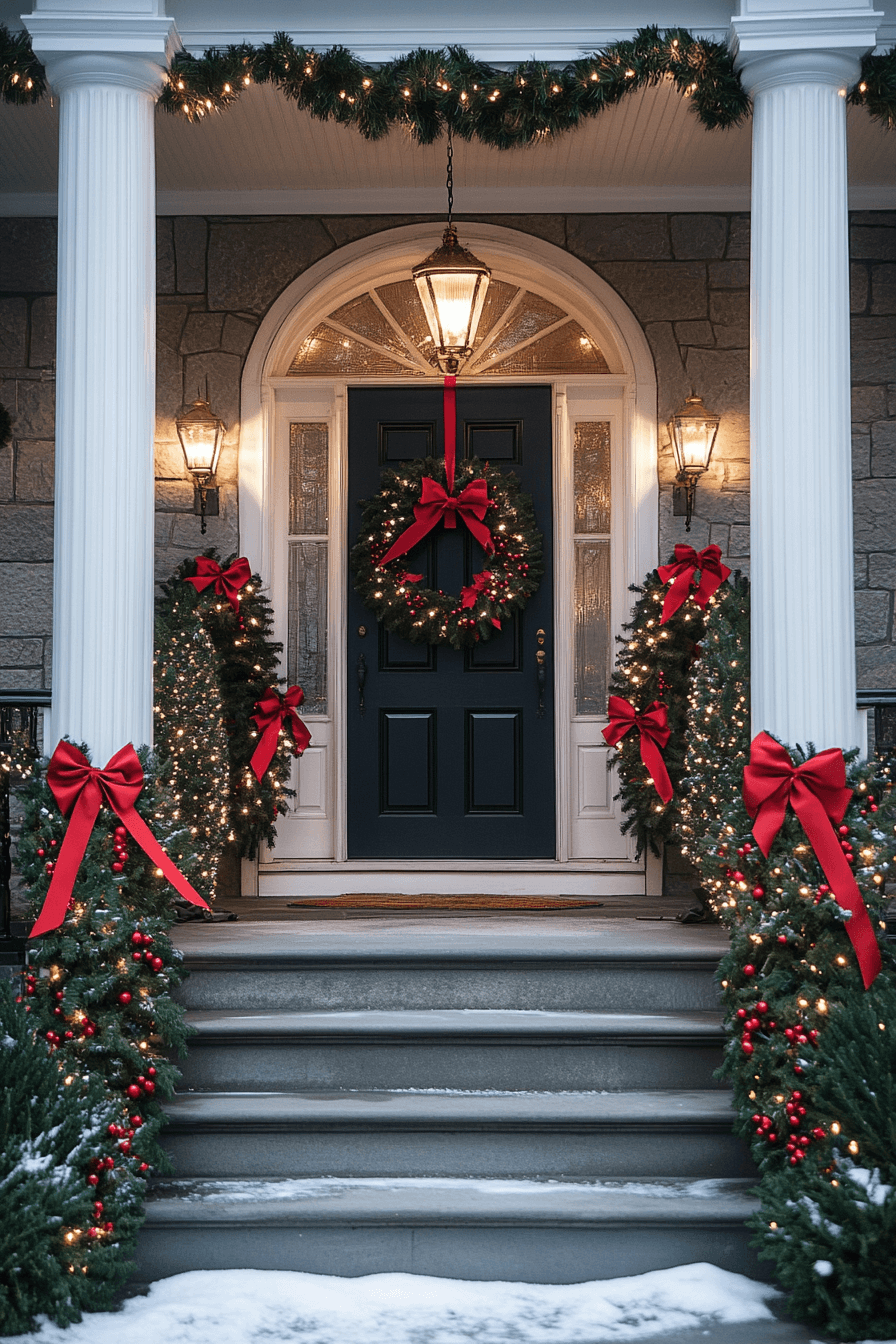 Light and greenery unite beautifully in this front porch Christmas decor that feels natural yet polished. Twinkling bulbs weave through full garlands that frame your doorway in warm radiance. Satin ribbons add softness to the scene.