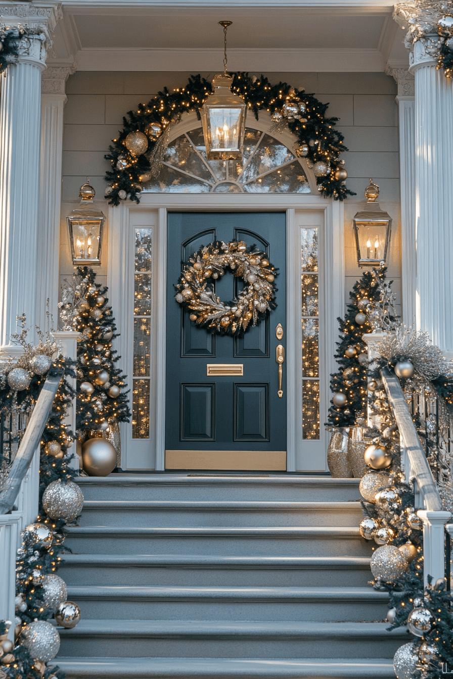 Elevate sparkle with front porch Christmas decor draped in metallic finishes. Shimmering ribbons, glittering spheres, and mirrored accents add a touch of glam. Under the lights, every element glistens like champagne bubbles. It’s luxe but approachable.