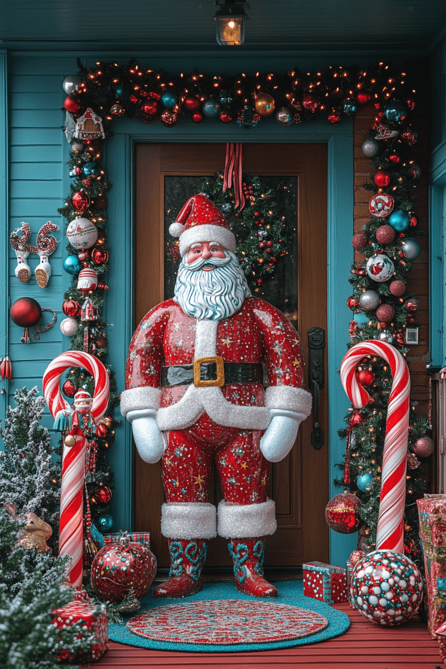 Add personality and fun to your front porch Christmas decor with oversized ornaments and whimsical touches. Playful Santas, colorful lights, and joyful props bring smiles before guests even knock. The mood is carefree and spirited. Perfect for families and laughter-filled evenings.