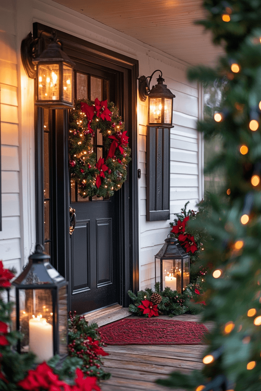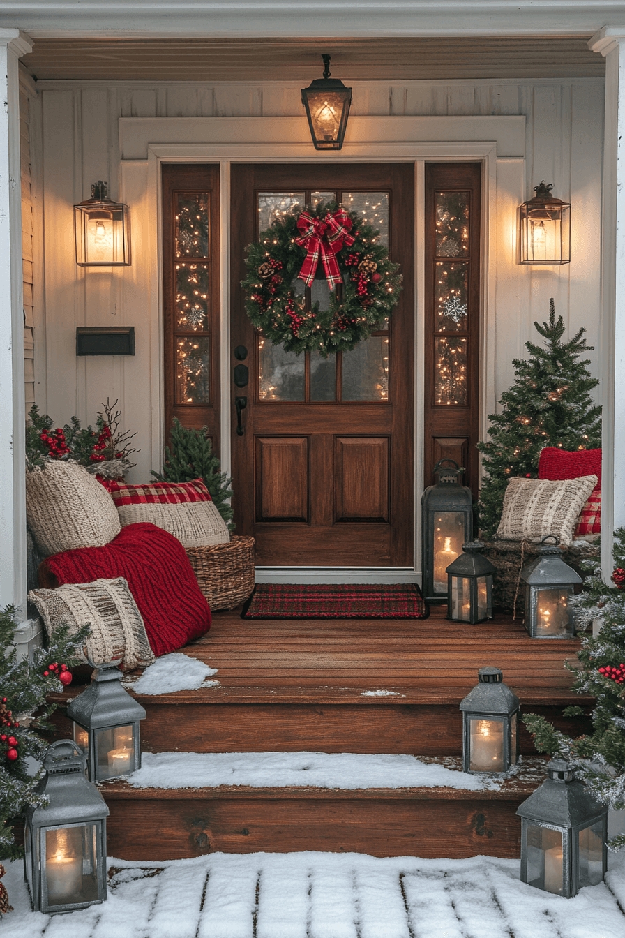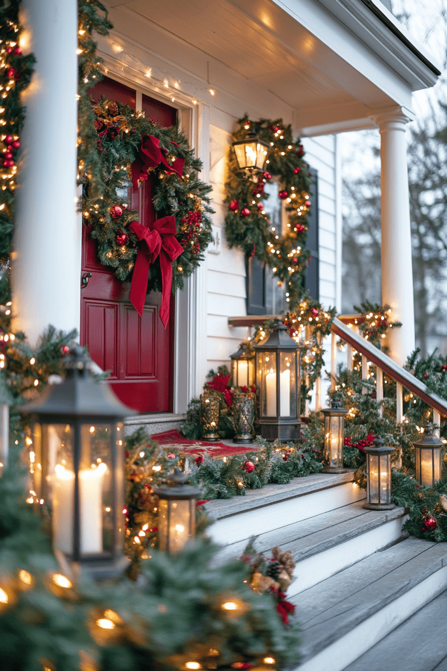 Keep tradition alive with front porch Christmas decor in classic red and green. Drape lush garlands, hang plaid bows, and line your steps with glowing candles. A wreath trimmed in holly completes the nostalgic charm. It’s familiar, warm, and endlessly festive.