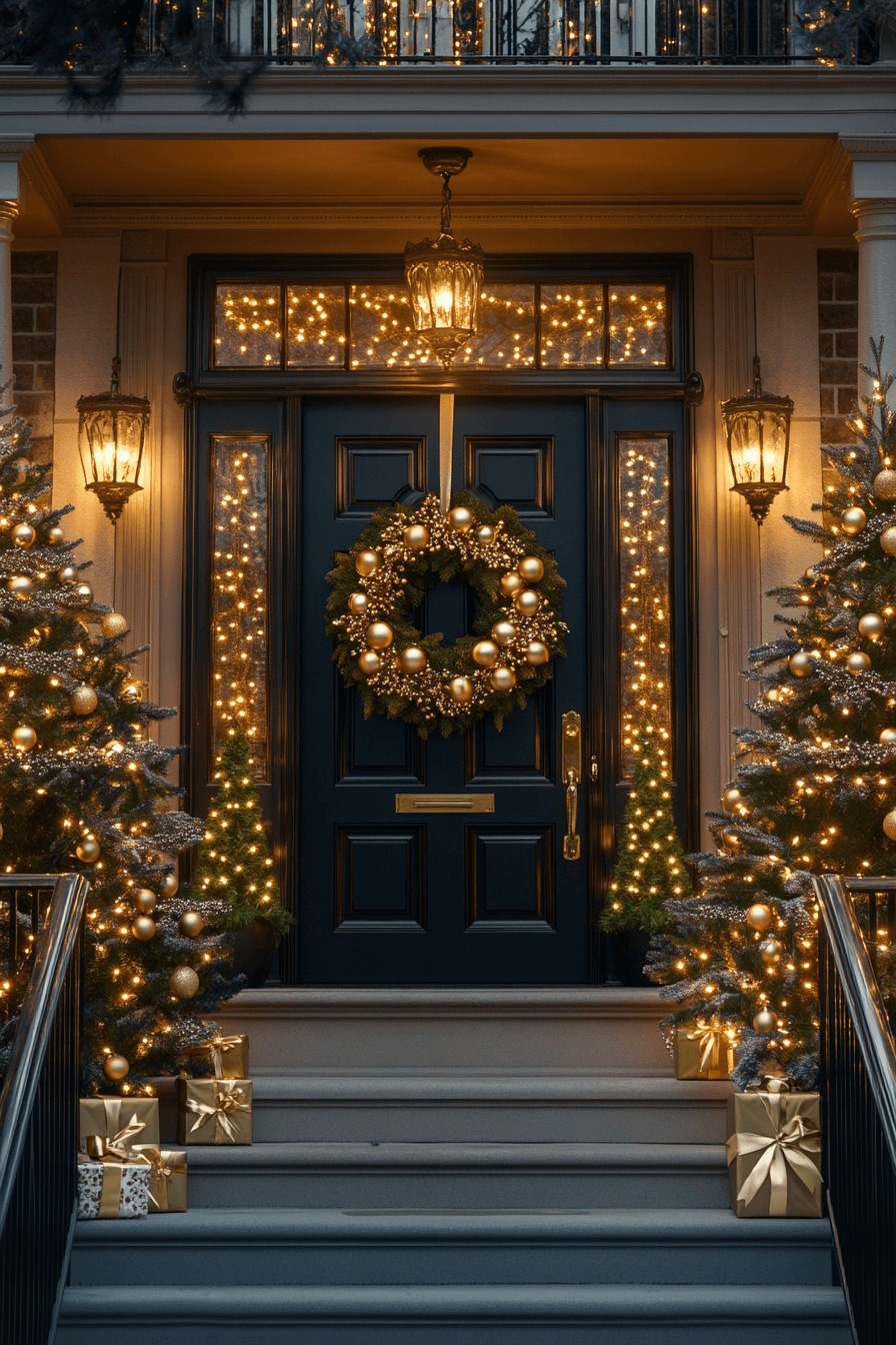 Luxury comes alive with front porch Christmas decor drenched in gold and champagne tones. Metallic ribbons twist through garlands, while crystal ornaments glisten under warm bulbs. Every detail speaks of refined celebration. It’s glamour with a gentle glow.