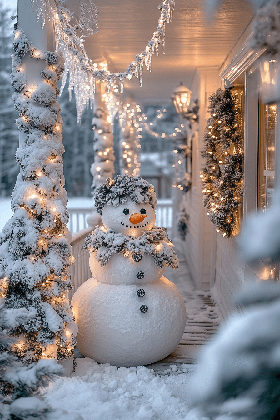 Frosted snowflakes and silvery sparkle define front porch Christmas decor with quiet elegance. Hang delicate ornaments from garlands and watch them shimmer with each breeze. The combination of white and crystal tones feels celestial.