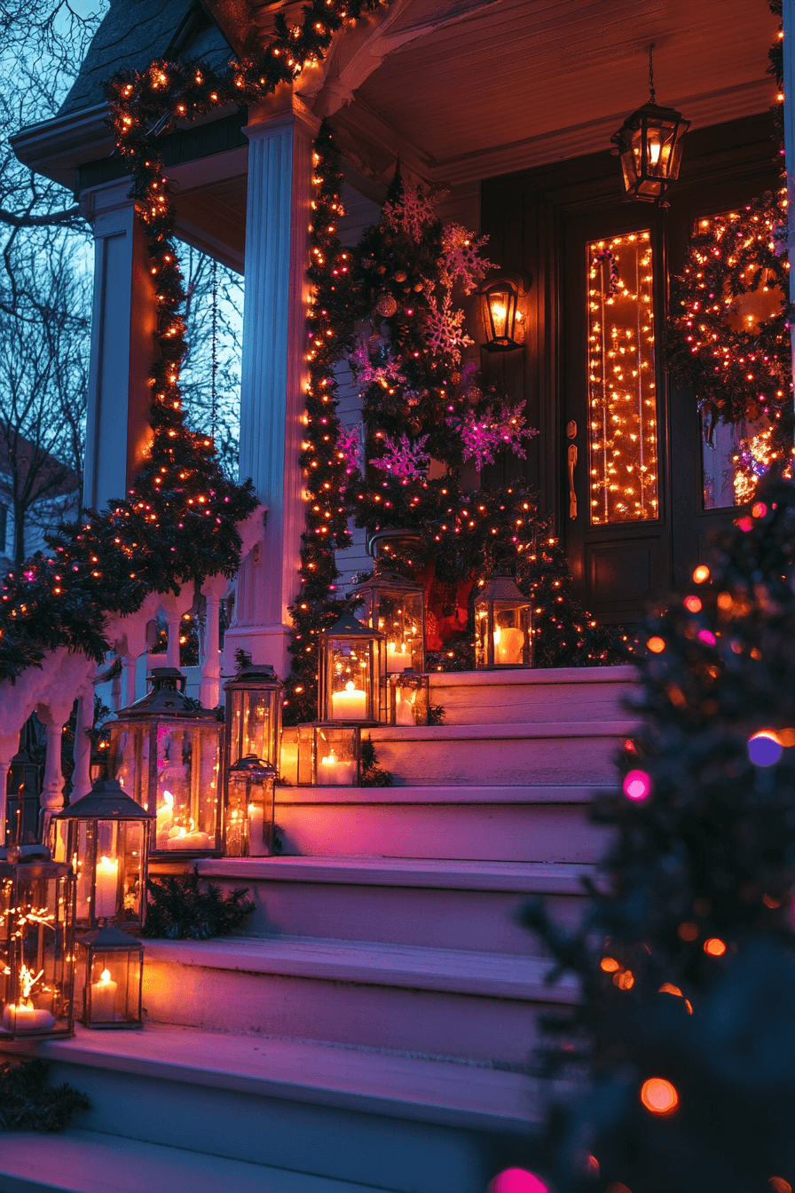 Turn your home into a glowing showcase with front porch Christmas decor that celebrates illumination. Multicolor bulbs, reflective ornaments, and radiant bows bring life to the night. Light patterns ripple gently across each step. The result is joyful motion in every direction.