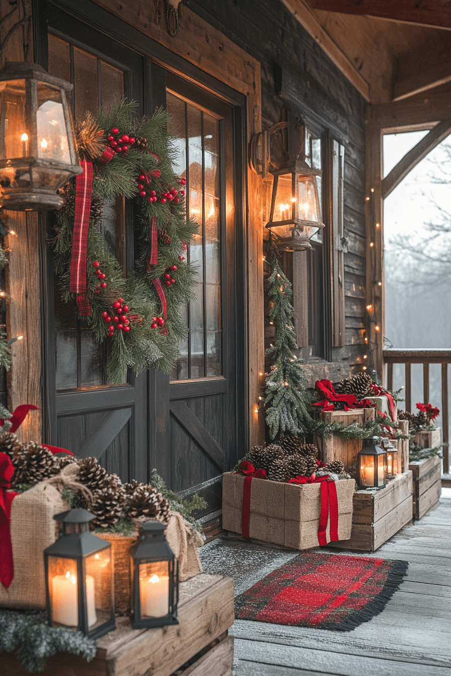 Channel rustic beauty with front porch Christmas decor grounded in nature’s textures. Wooden crates, burlap ribbons, and pine garlands pair perfectly with glowing lanterns. The scent of evergreen fills the air. It’s cozy, heartfelt, and full of charm.