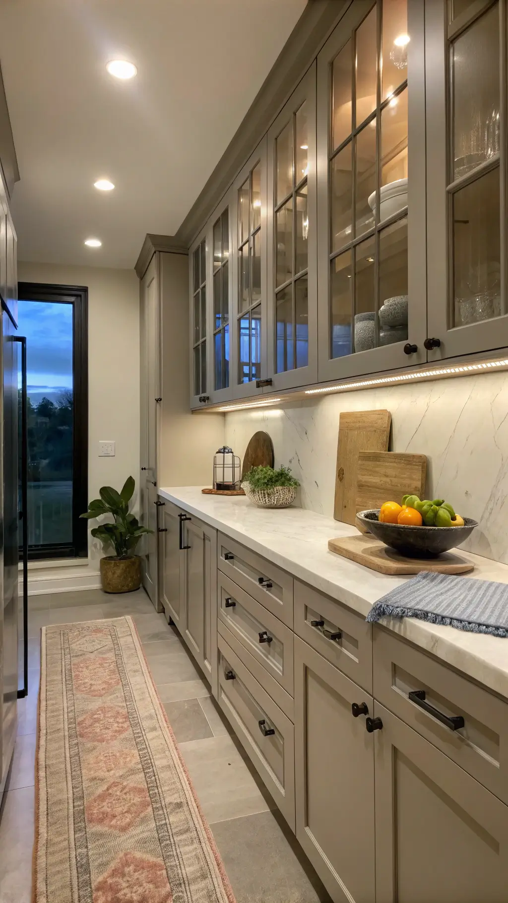 - Open glass-front upper cabinets for visual lightness
