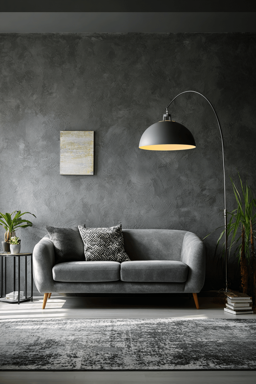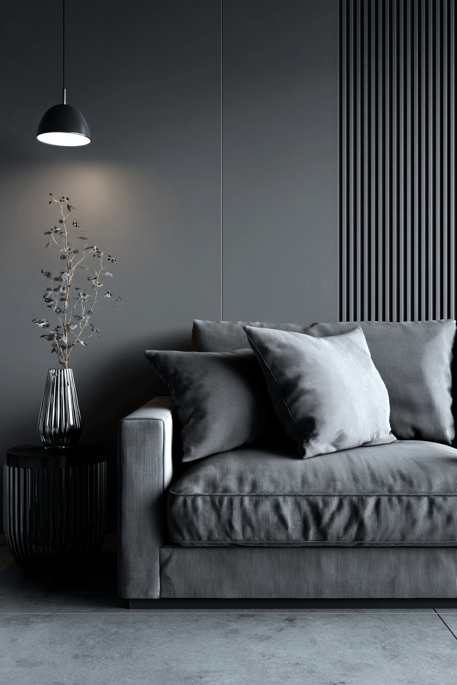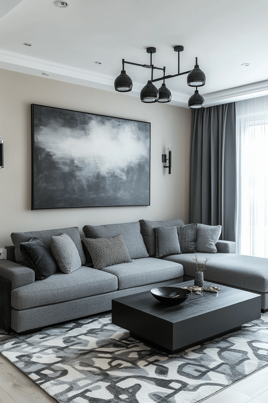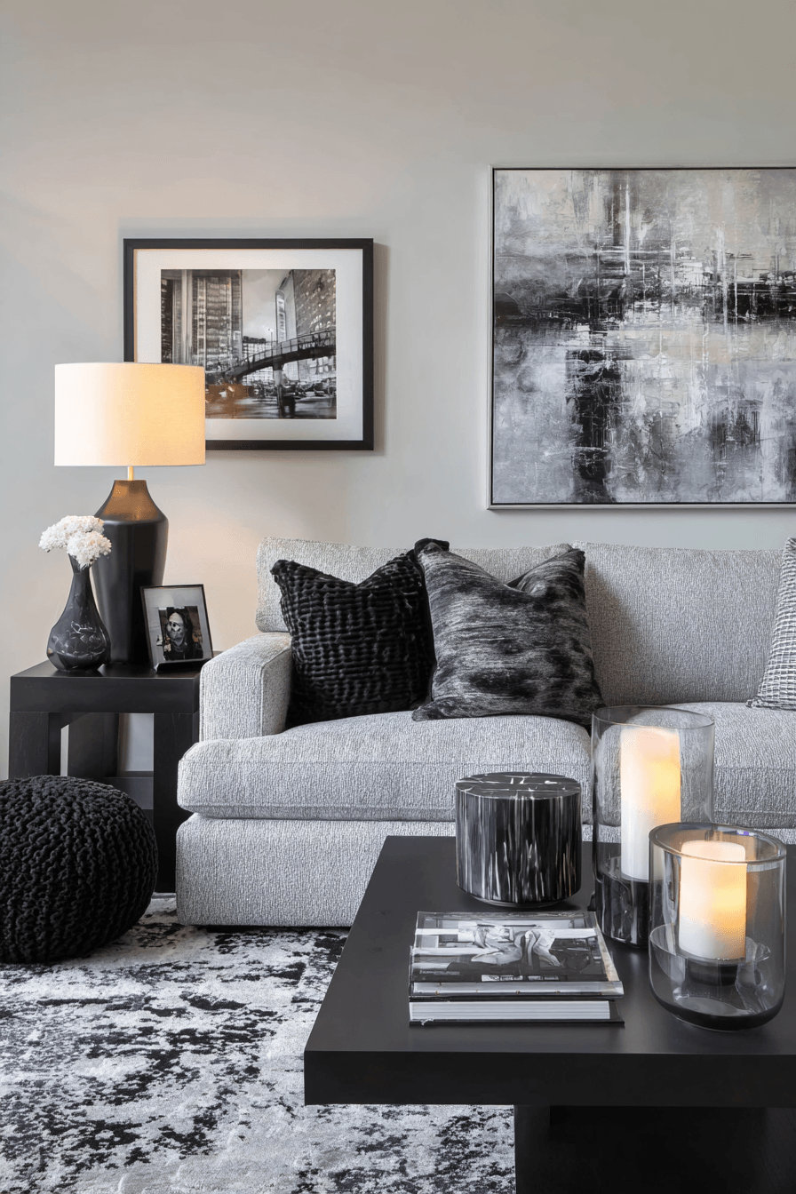 Sharp contrasts give this grey couch living room a bold and modern personality. The grey couch is paired with striking black elements for visual impact. Clean lines keep the design structured and balanced. Minimal decor allows the contrast to shine. The result feels confident and stylish. Explore more grey couch living room ideas with bold contrast.