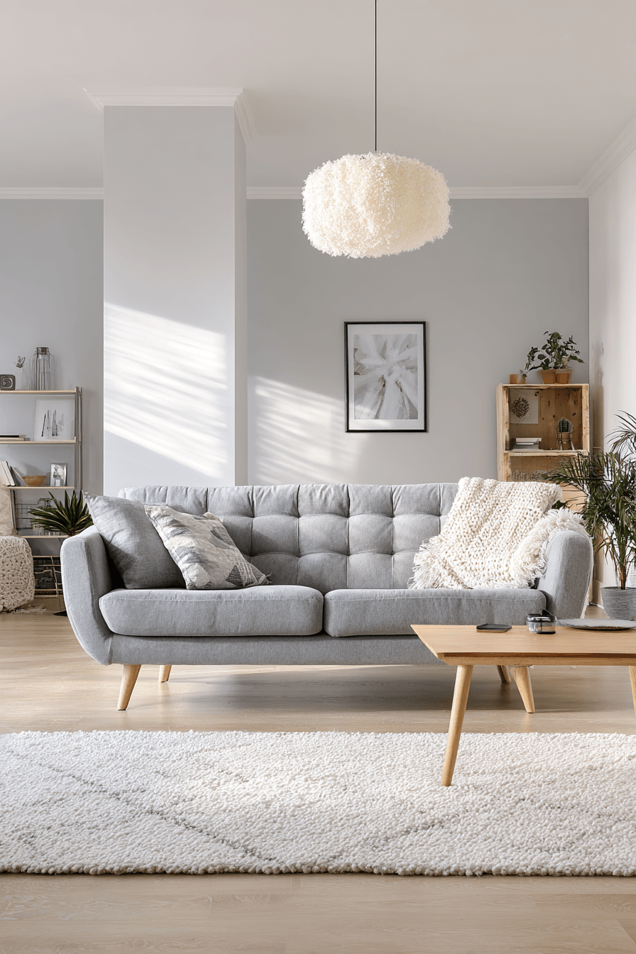 Scandinavian influence brings a bright and calming feel to this grey couch living room. The grey couch pairs with light wood and crisp white elements. Cozy textiles soften the minimalist design. Clean lines keep the layout functional and open. The space feels peaceful and inviting. Explore more grey couch living room ideas with Nordic charm.