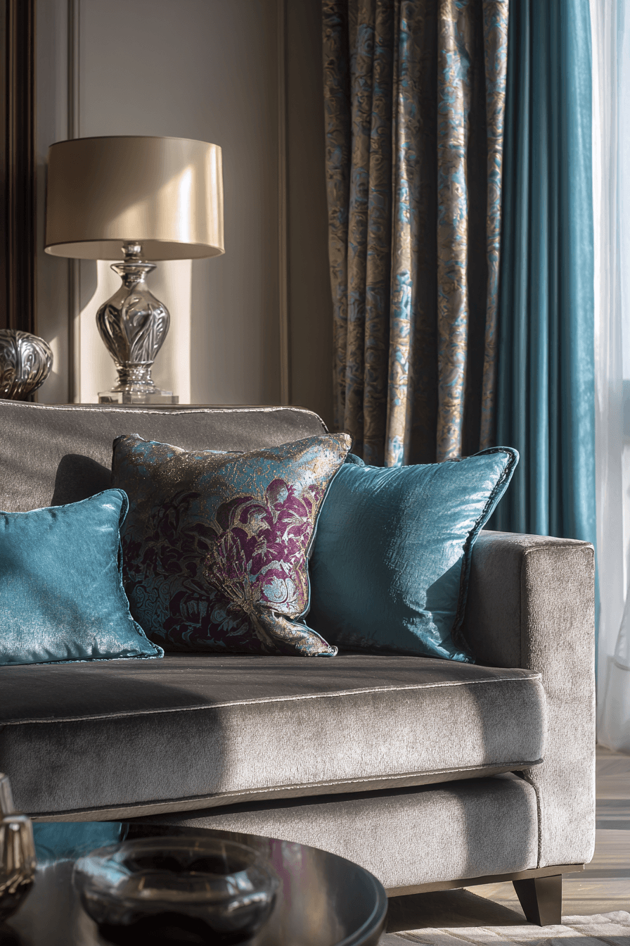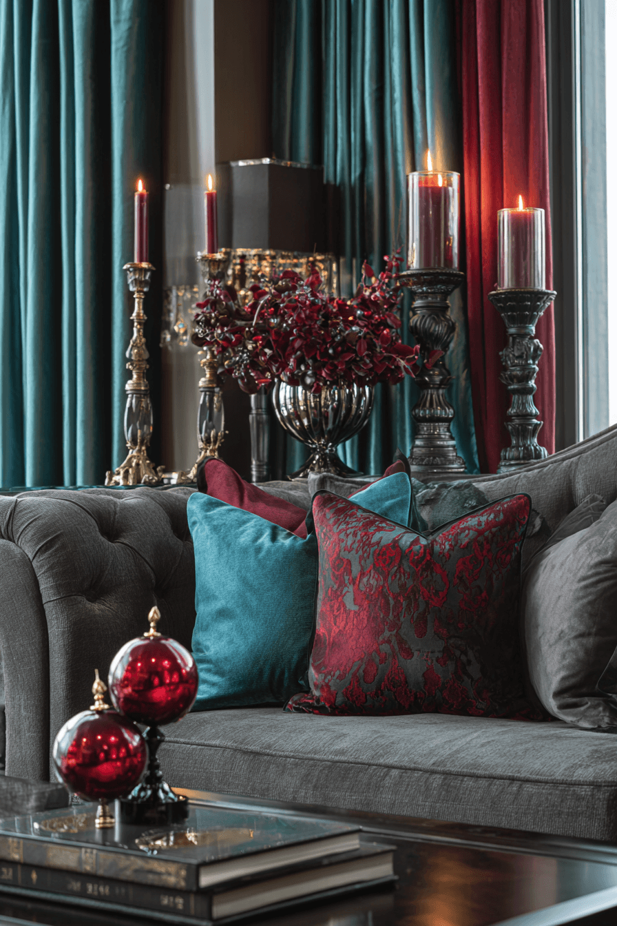 Rich jewel tones bring bold elegance into this grey couch living room with vibrant contrast. The grey couch pairs beautifully with deep, saturated hues. These colors add depth and sophistication. Metallic details enhance the luxurious feel. The space feels dramatic and refined. Discover more grey couch living room ideas with bold color.