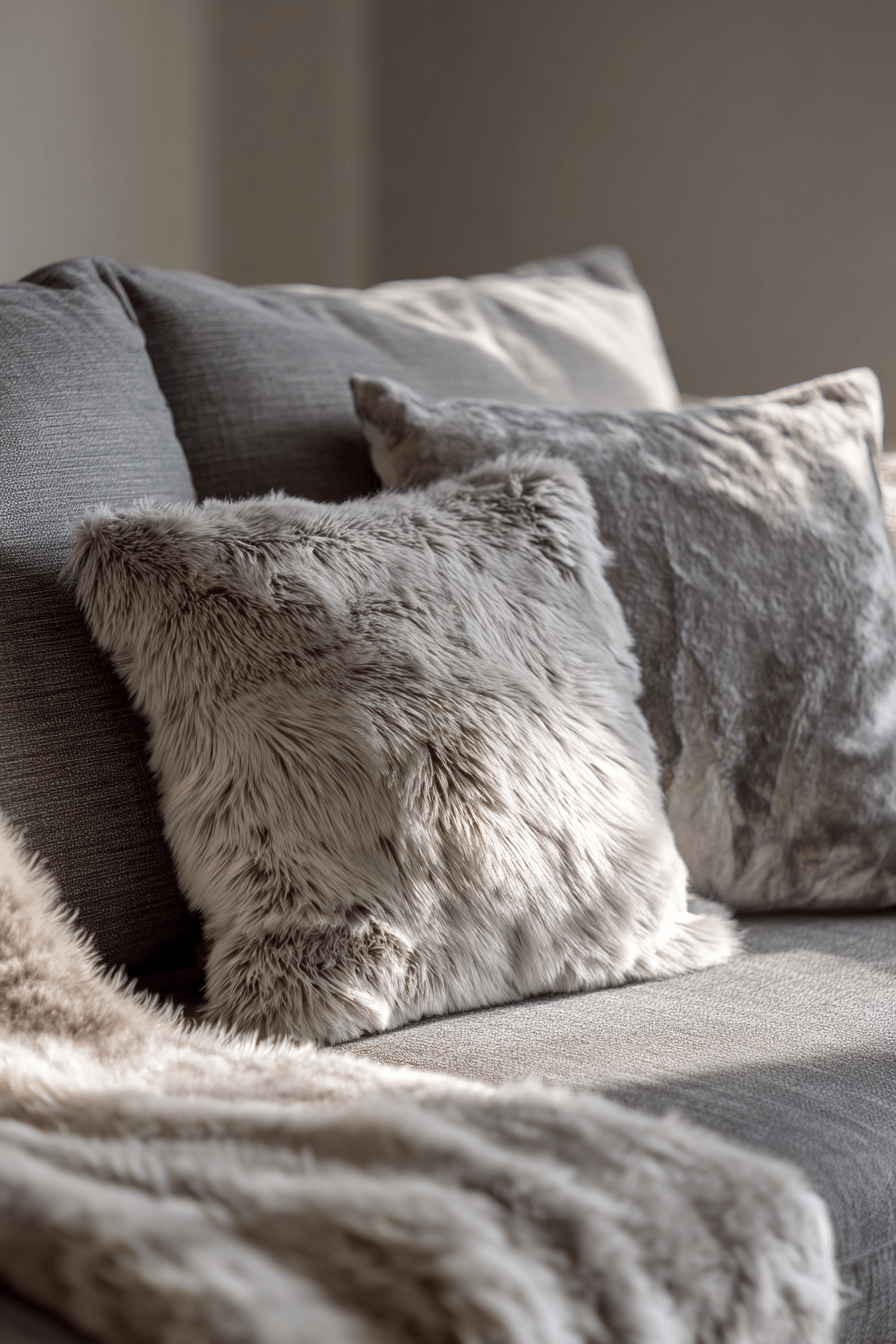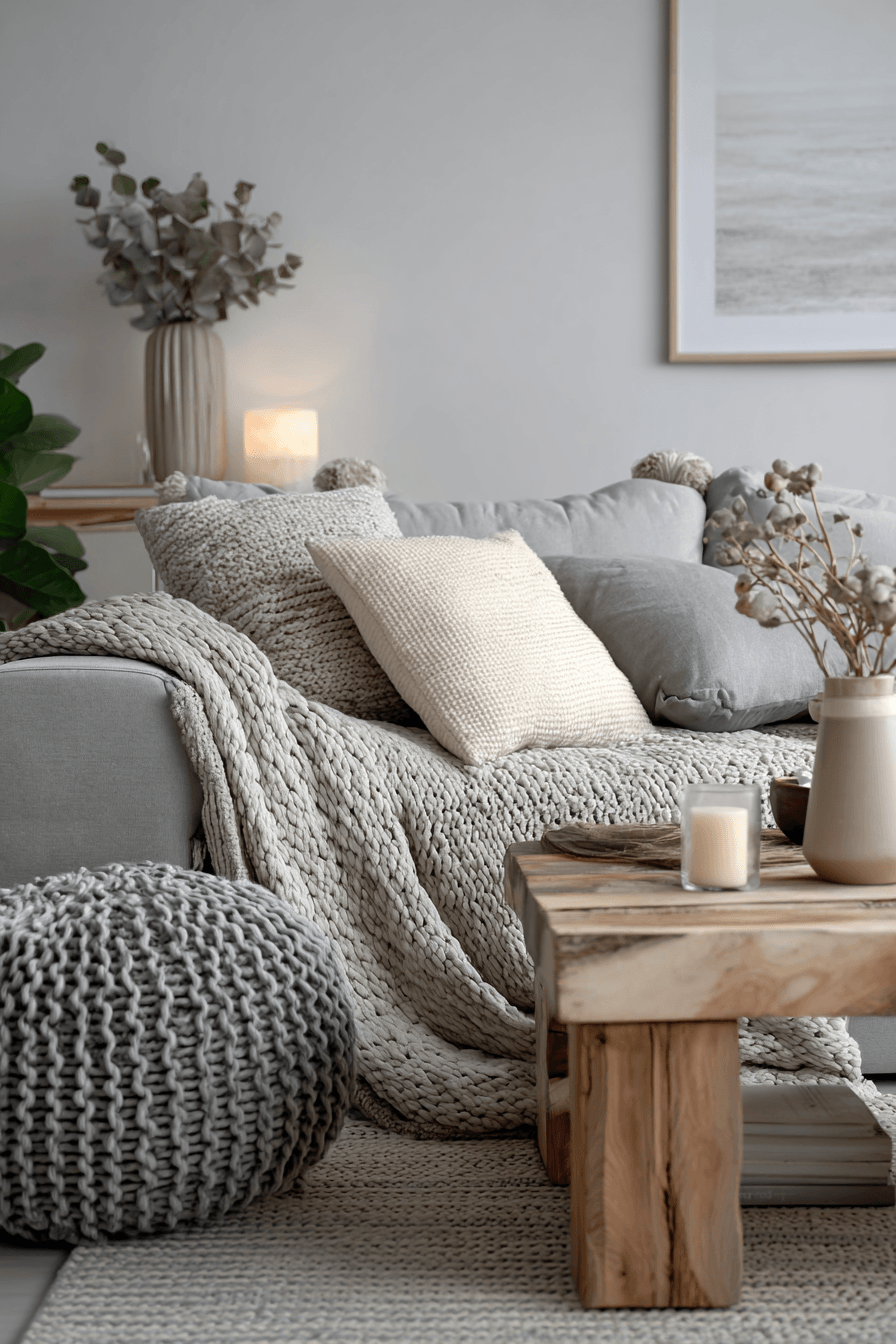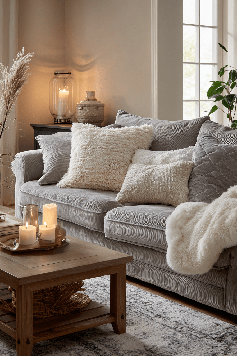 Soft comfort takes over this grey couch living room with cozy layers and textures throughout. The grey couch is styled with plush cushions and throws. Warm fabrics enhance the inviting atmosphere. A soft rug completes the look beautifully. The space feels relaxing and snug. Explore more grey couch living room ideas designed for comfort.