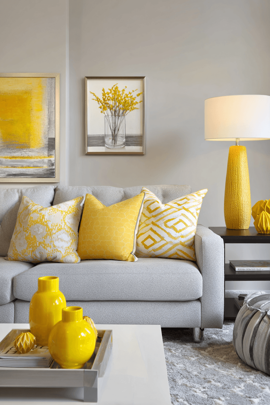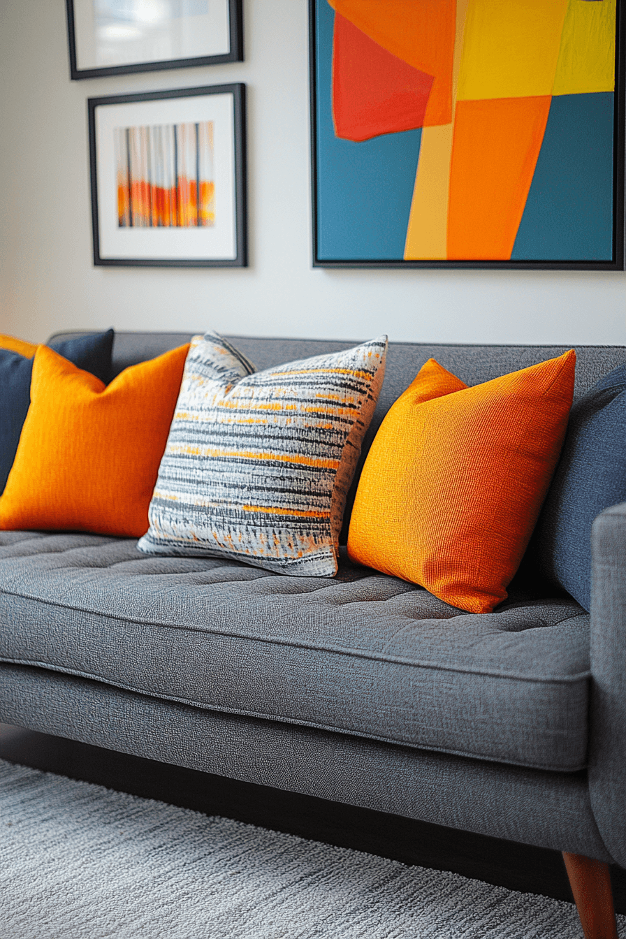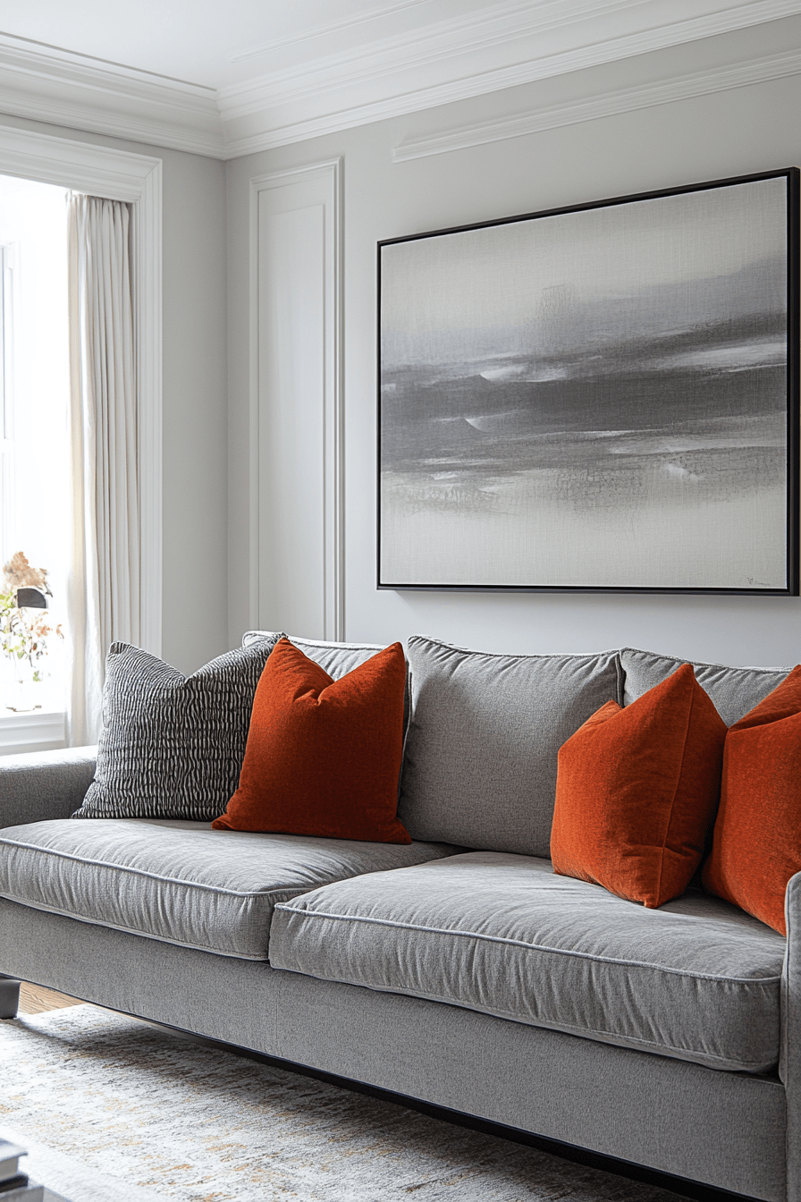 Bright accent tones bring a lively energy into this grey couch living room that feels playful and fresh. The grey couch acts as a neutral base for vibrant decor. Pops of color add personality and movement. Soft layers keep the space cozy and inviting. The design feels cheerful and dynamic. Discover more grey couch living room ideas that feel vibrant.