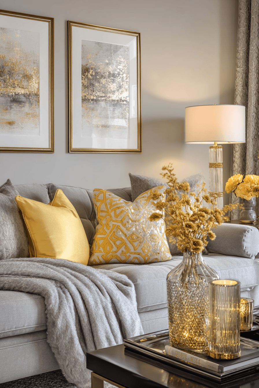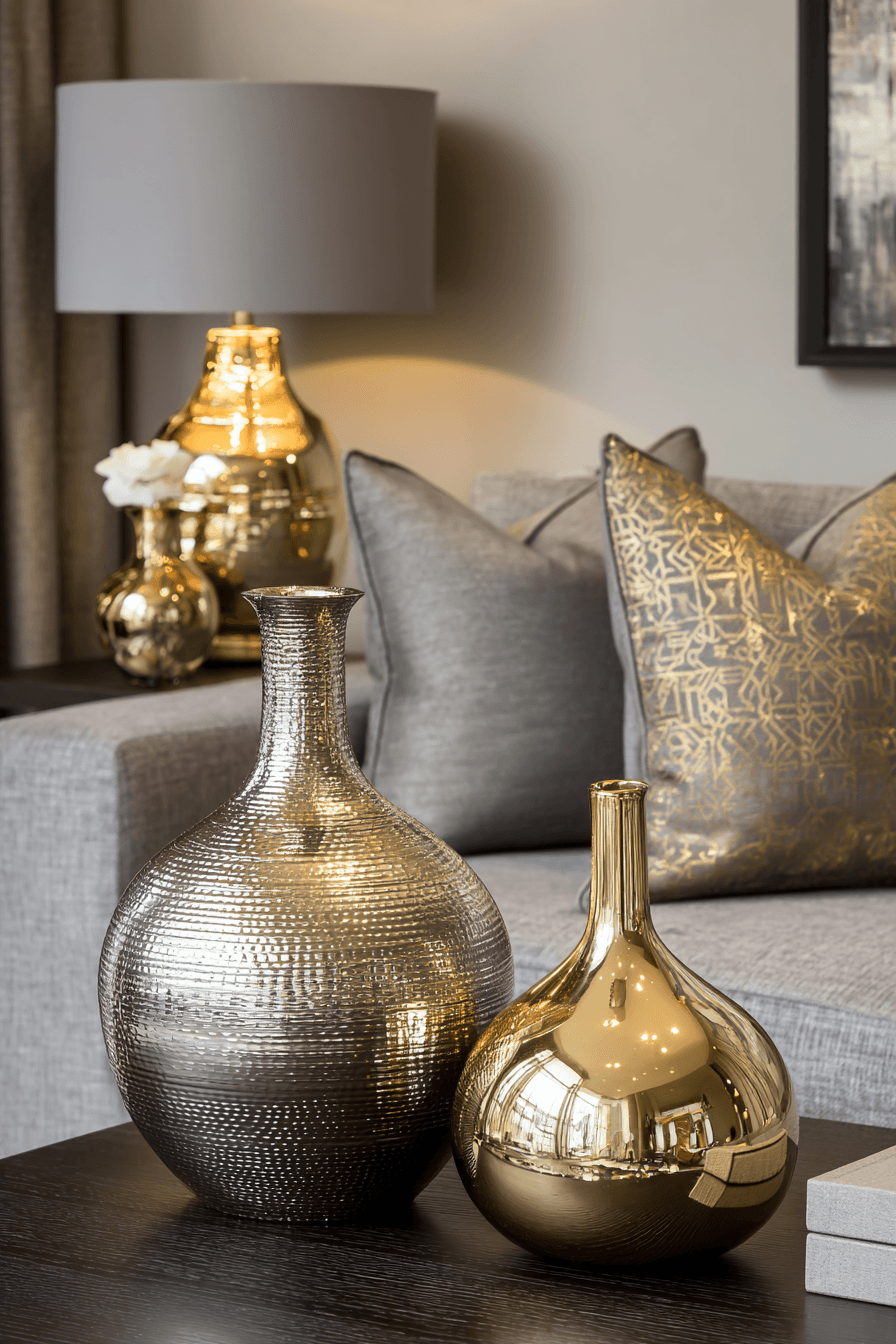 Metallic finishes introduce shine and sophistication into this grey couch living room. The grey couch is styled with gold and silver accents throughout. Reflective surfaces brighten the space beautifully. Clean lines keep everything modern and balanced. The design feels sleek and elevated. Explore more grey couch living room ideas with metallic accents.