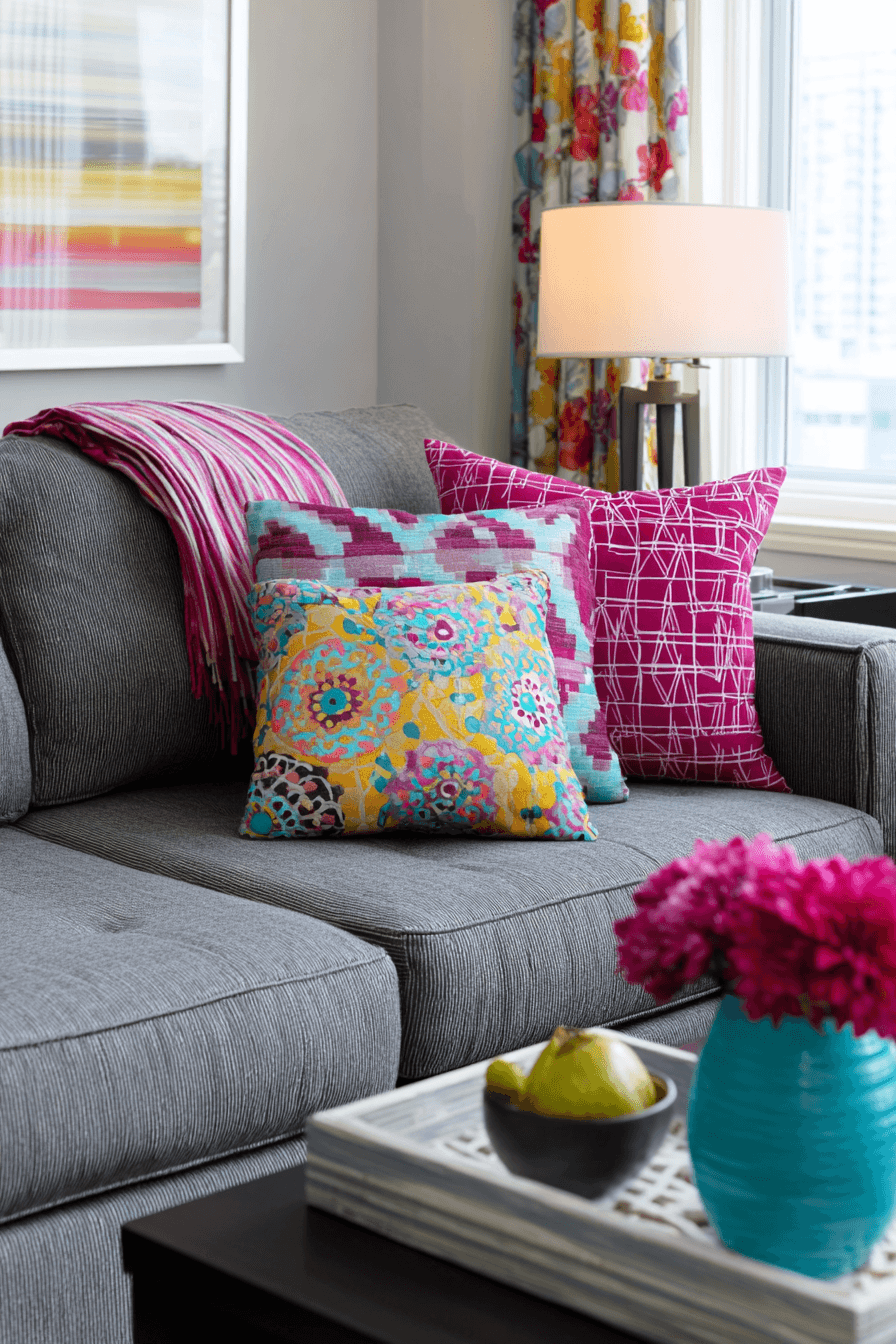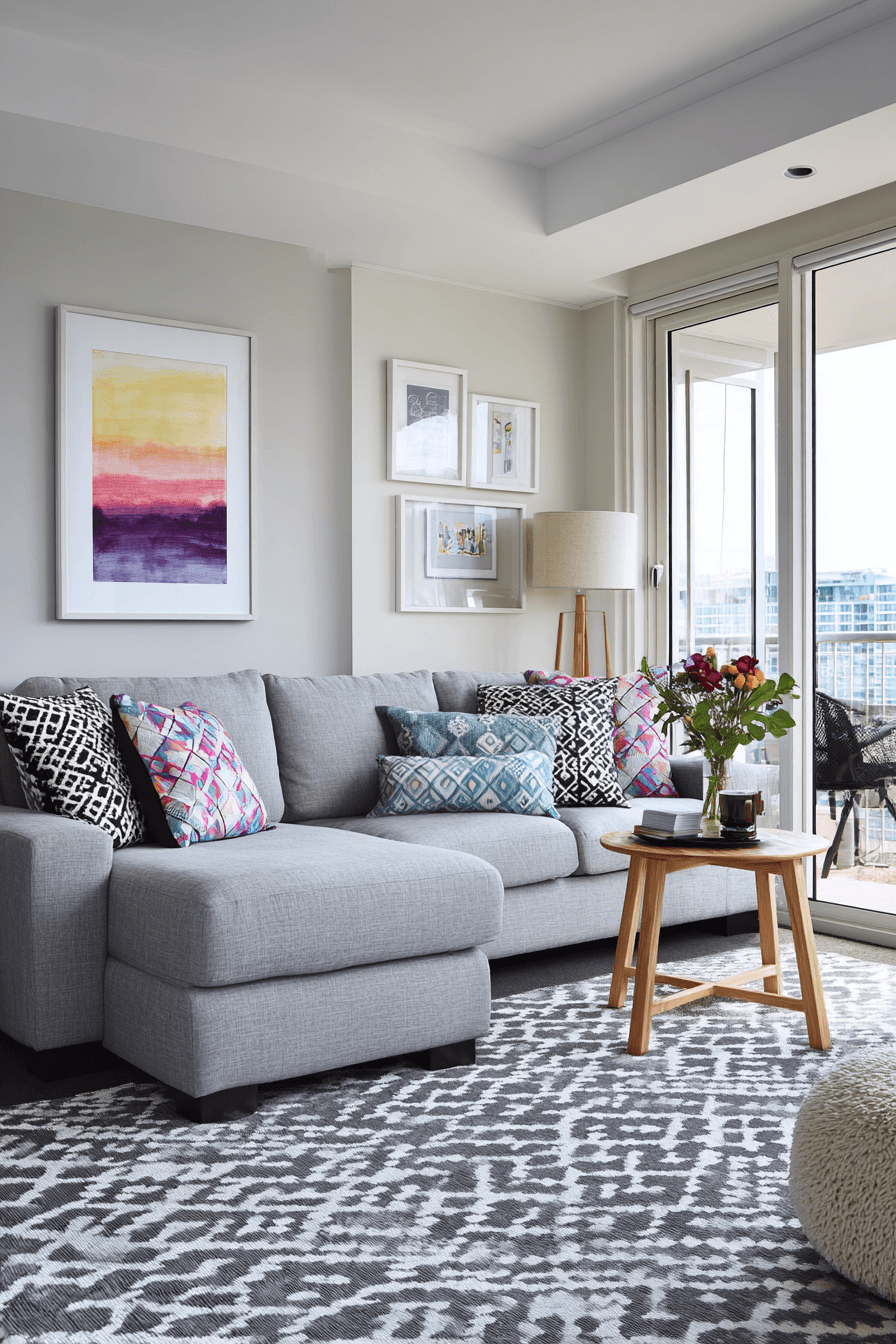 Colorful decor adds energy and playfulness to this grey couch living room while keeping it stylish. The grey couch anchors the design as bold hues stand out. Pops of color create movement and personality. Soft textures maintain comfort throughout. The space feels lively and welcoming. Discover more grey couch living room ideas with vibrant touches.