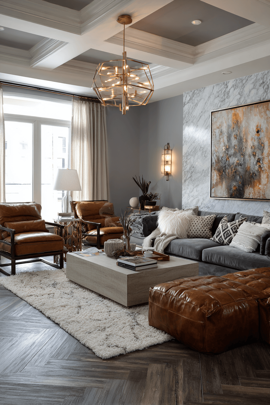 Blended materials create a stylish balance in this grey couch living room that feels both cozy and refined. The grey couch pairs with leather accents for contrast. Wooden elements add warmth throughout the space. Layered textiles enhance comfort and depth. The design feels polished and inviting. Explore more grey couch living room ideas with mixed materials.