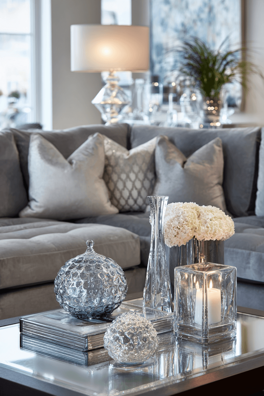 Glass elements introduce a light and airy feel into this grey couch living room with modern appeal. The grey couch works seamlessly with transparent furniture. These materials reflect light and open up the space. Simple styling keeps everything balanced. The design feels bright and effortless. Explore more grey couch living room ideas with airy elements.