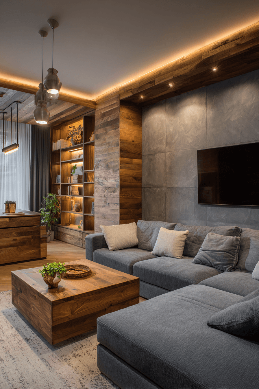 Natural wood tones add warmth and balance into this grey couch living room with a grounded feel. The grey couch contrasts beautifully with wooden finishes. This pairing creates a cozy yet modern atmosphere. Soft textiles enhance comfort. The space feels inviting and relaxed. Discover more grey couch living room ideas with wood accents.
