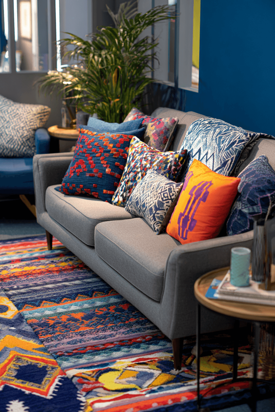 Geometric designs bring structure and interest into this grey couch living room. The grey couch pairs perfectly with bold patterned elements. These shapes add a modern edge without overwhelming the space. Clean furniture keeps the layout balanced. The overall look feels dynamic and stylish. Explore more grey couch living room ideas with geometric style.